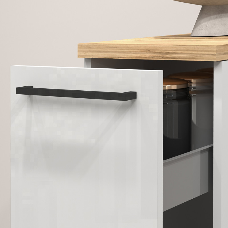 La qualité de fabrication est au cœur de ce produit pensé pour durer. La structure est composée de panneaux de particules mélaminés de première qualité, d'une épaisseur de 16 mm, garantissant robustesse et stabilité dans le temps. Le plateau de 25 mm avec chants ABS renforce la résistance de l'ensemble, tandis que les poignées en aluminium apportent une touche design et une prise en main agréable. En véritable armoire de rangement du quotidien, ce meuble bas sur piétement PVC propose un tiroir soigneusement conçu pour accueillir vos ustensiles, épices ou accessoires de cuisine avec ordre et facilité.