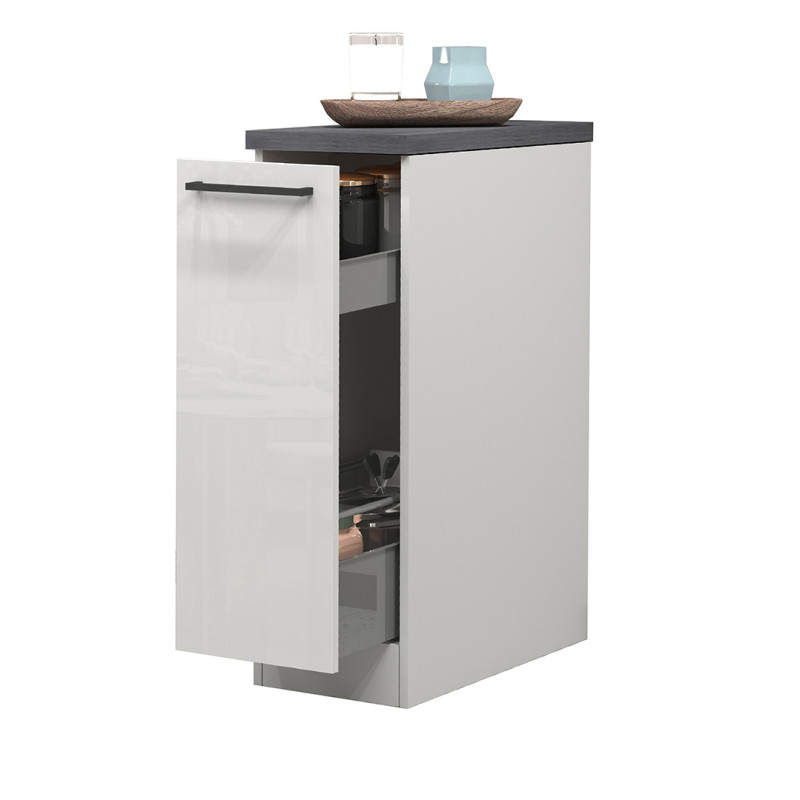 Son tiroir unique, fluide et fonctionnel, en fait un meuble de rangement cuisine particulièrement adapté pour accueillir ustensiles, épices ou petits accessoires du quotidien. Le piètement en PVC assure une stabilité optimale sur tout type de sol, tandis que la finition mélaminée facilite l'entretien : un simple chiffon doux et humide suffit à conserver son éclat. Ce meuble bas de rangement allie ainsi performance pratique et souci du détail esthétique, pour une cuisine toujours ordonnée et accueillante.