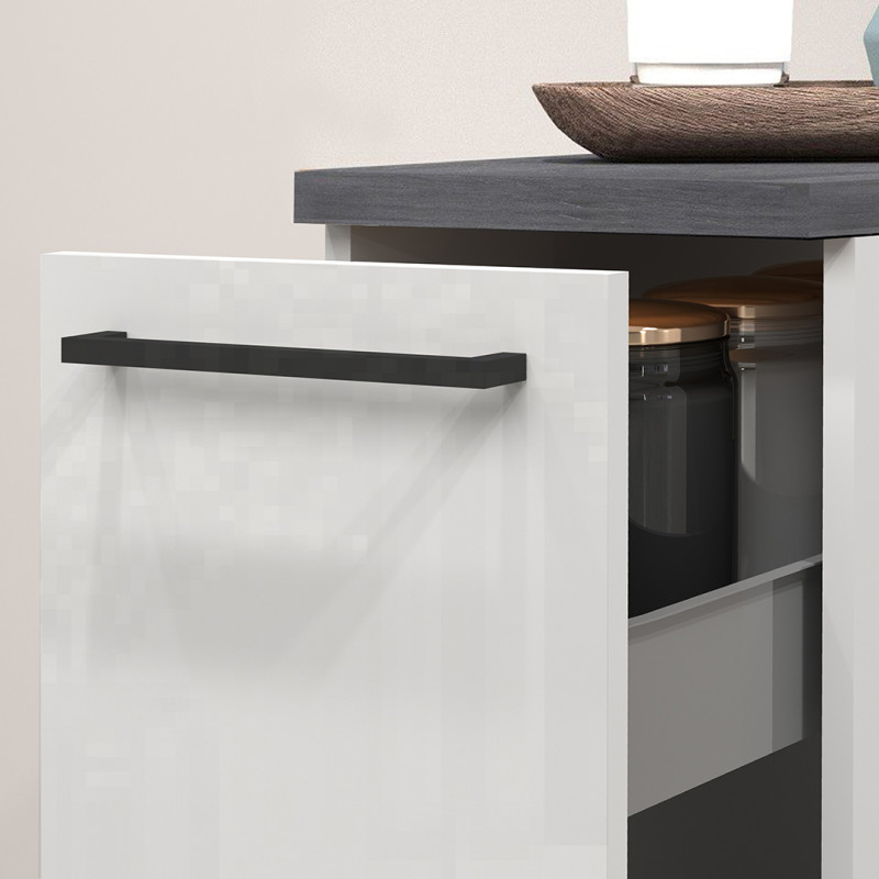 | Structure | Panneaux de particules mélaminés de première qualité de 16 mm d'épaisseur (corps : blanc mat/façades : blanc brillant) - plateau 25 mm avec chants ABS - poignées en aluminium |