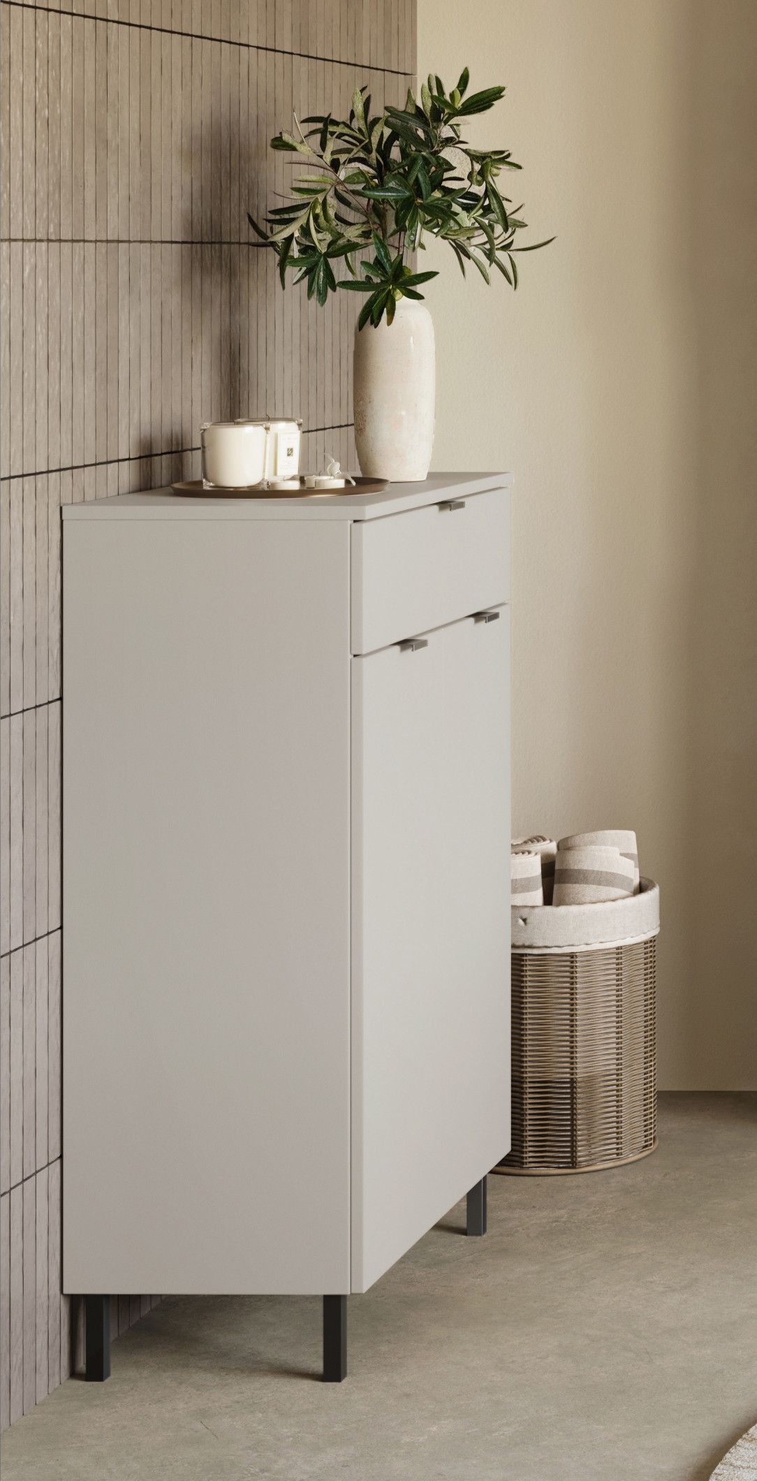Le meuble bas de salle de bain Ariana séduit par son design épuré et contemporain, parfaitement adapté aux intérieurs modernes. Fabriqué en Allemagne par la marque Vivabita, il se distingue par sa finition soignée en mélaminé gris cachemire, un coloris tendance qui apporte une touche de douceur et de sophistication à votre pièce d’eau. Ce meuble de rangement s’intègre harmonieusement dans tous les styles de décoration, tout en optimisant l’espace vertical grâce à ses dimensions compactes de 60 cm de largeur, 97 cm de hauteur et 34 cm de profondeur.