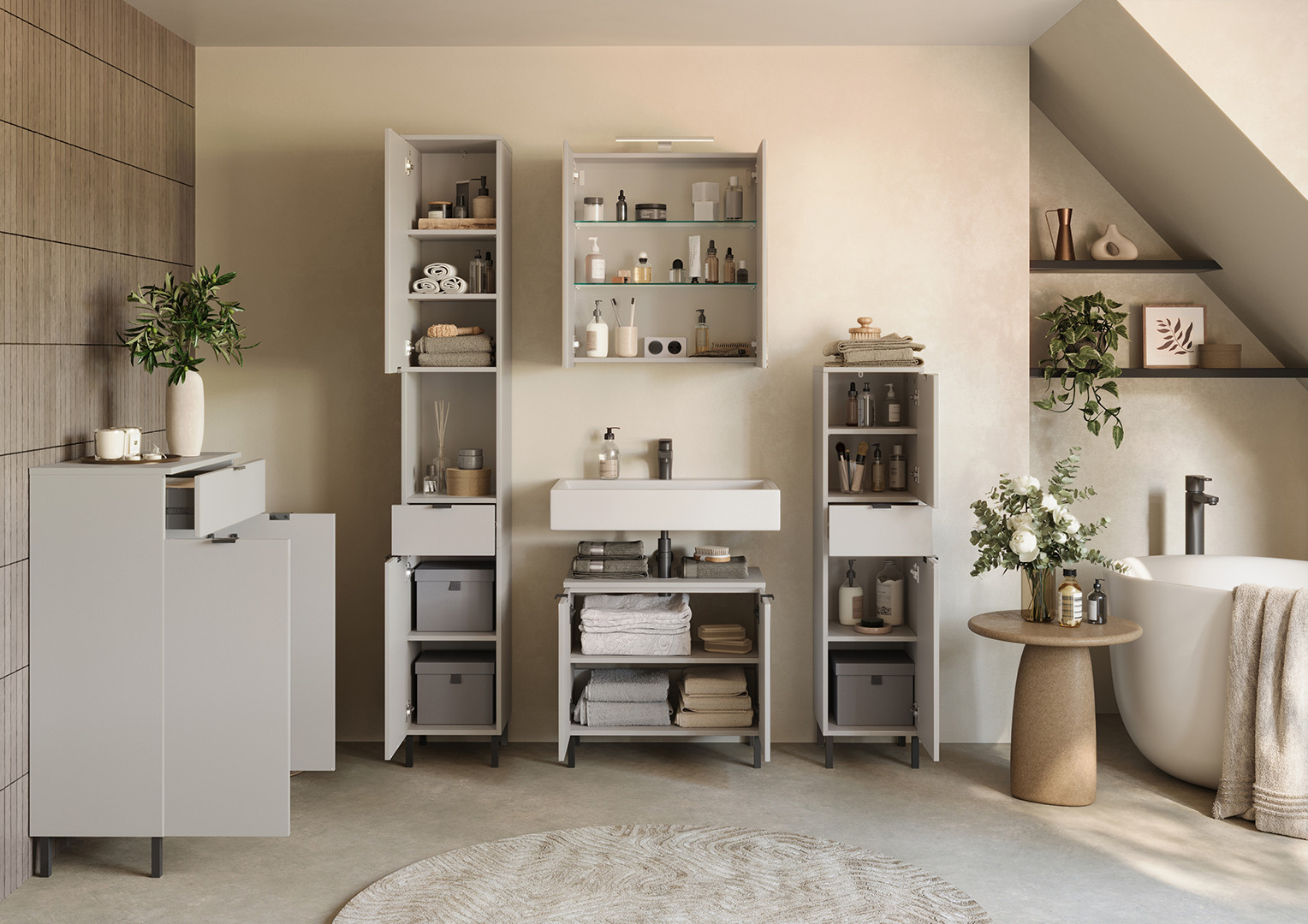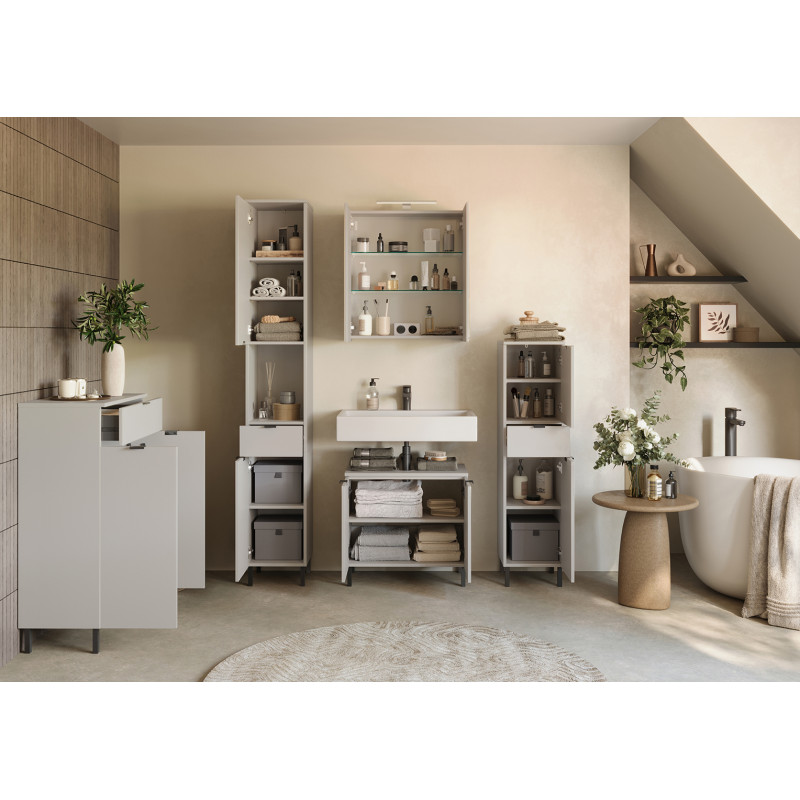 | Colonne de salle de bain moderne H 190 cm gris cachemire Ariana | | Longueur: 30 cm Hauteur: 190 cm Profondeur: 34 cm | En stock 1 à 2 semaines | 299 € 99 | ||