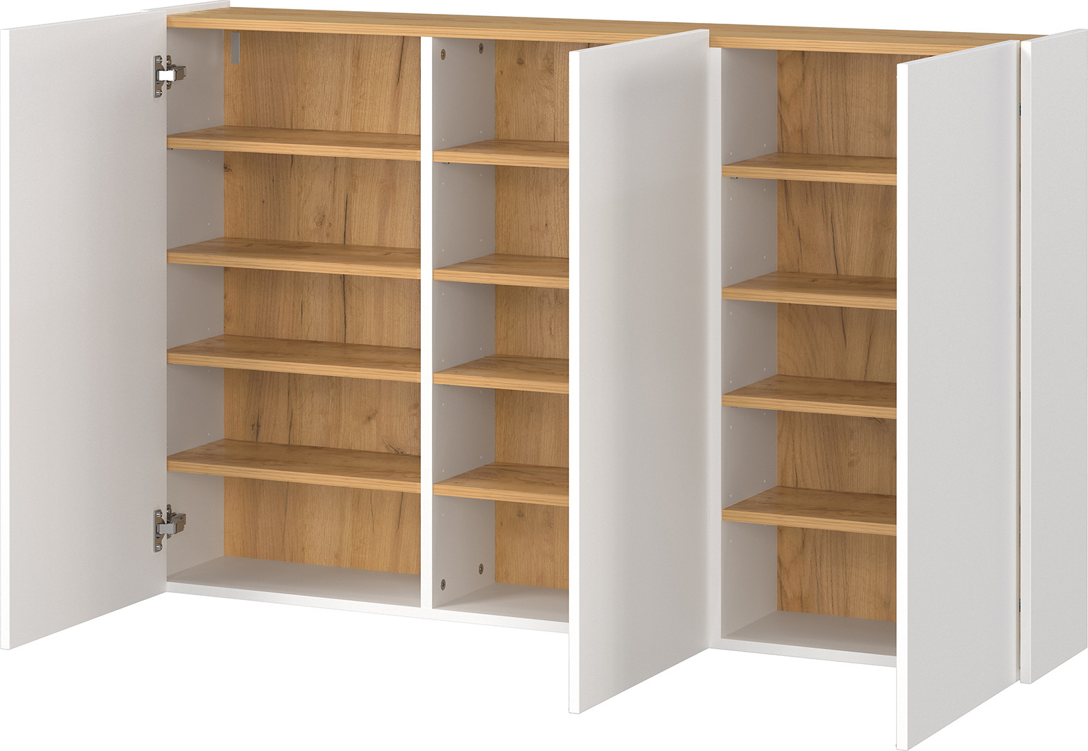 Ce meuble d’entrée se démarque par ses trois portes battantes équipées d’amortisseurs pour un usage tout en douceur. À l’intérieur, trois étagères fixes et neuf réglables vous permettent de personnaliser le rangement selon vos besoins. Un véritable allié pour organiser efficacement vos affaires ! Fabriqué en Allemagne, il reflète une qualité irréprochable et s’entretient facilement avec un simple chiffon doux. Découvrez nos autres options en visitant notre page dédiée au meuble d’entrée.