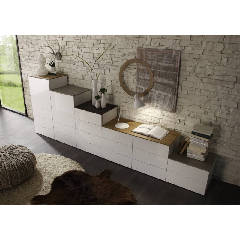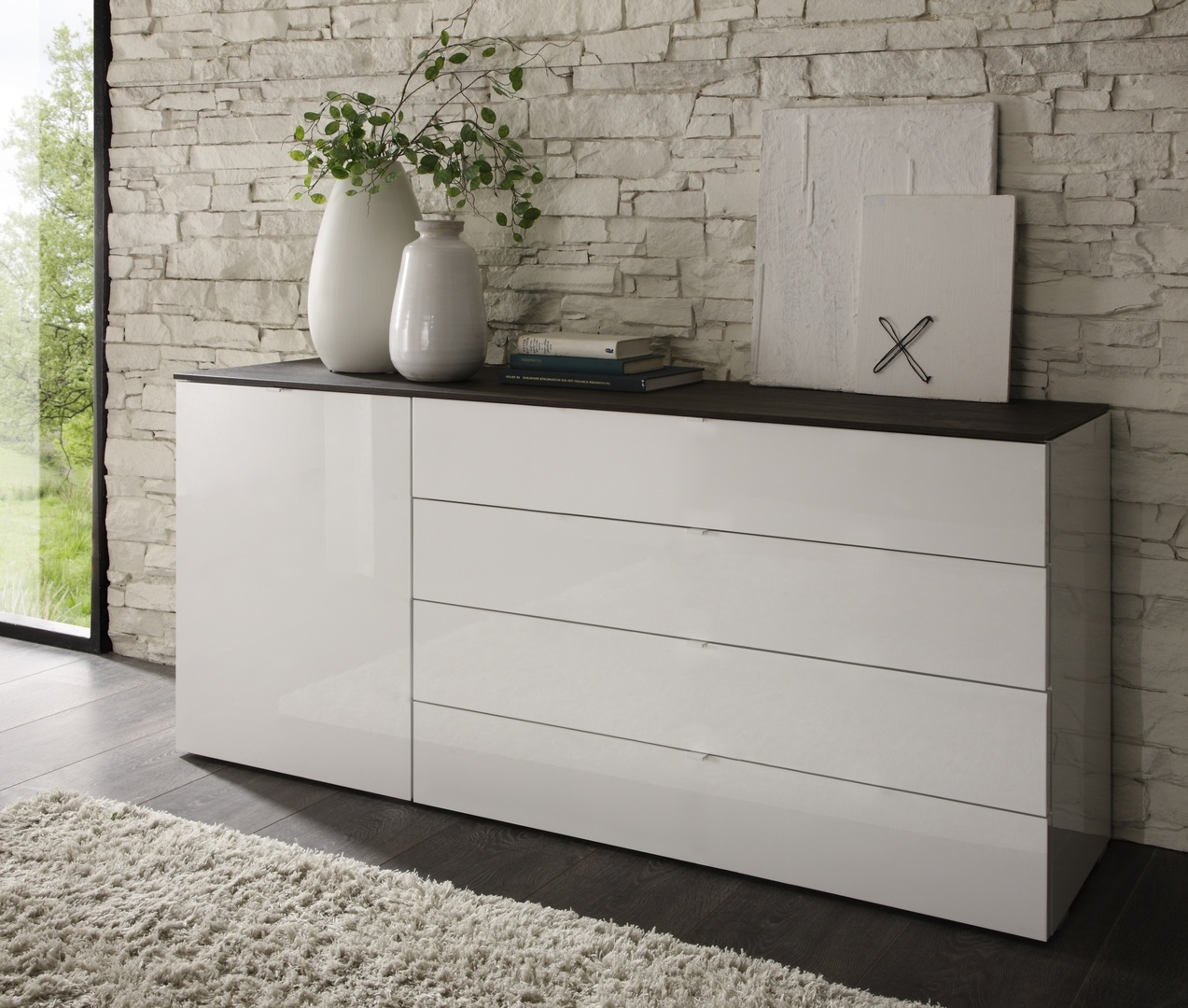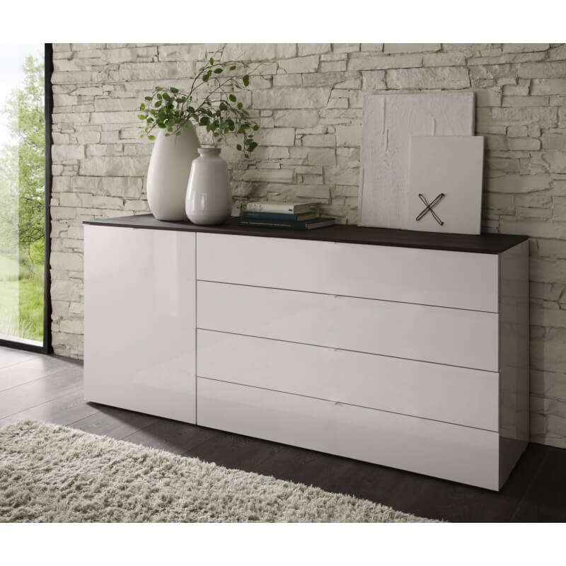 Le meuble de rangement design Louisa II s'intègrera parfaitement dans votre intérieur tout en apportant une touche lumineuse grâce à son coloris blanc laqué brillant. Sa structure est fabriquée en panneaux de particules de première qualité de 16 mm d'épaisseur. Il se compose de 2 meubles surmonté d'un plateau disponible en 3 coloris : un meuble 1 porte comprenant une étagère intérieure et un meuble 4 tiroirs montés sur coulisses métalliques dotées de la fermeture Soft close. Les poignées en métal verni vous garantiront une excellente prise en main. Le meuble de rangement Louisa II est équipé de pieds ronds noirs invisibles. Pour un ensemble harmonieux, vous pourrez choisir les autres éléments de la gamme Louisa vendus séparément.