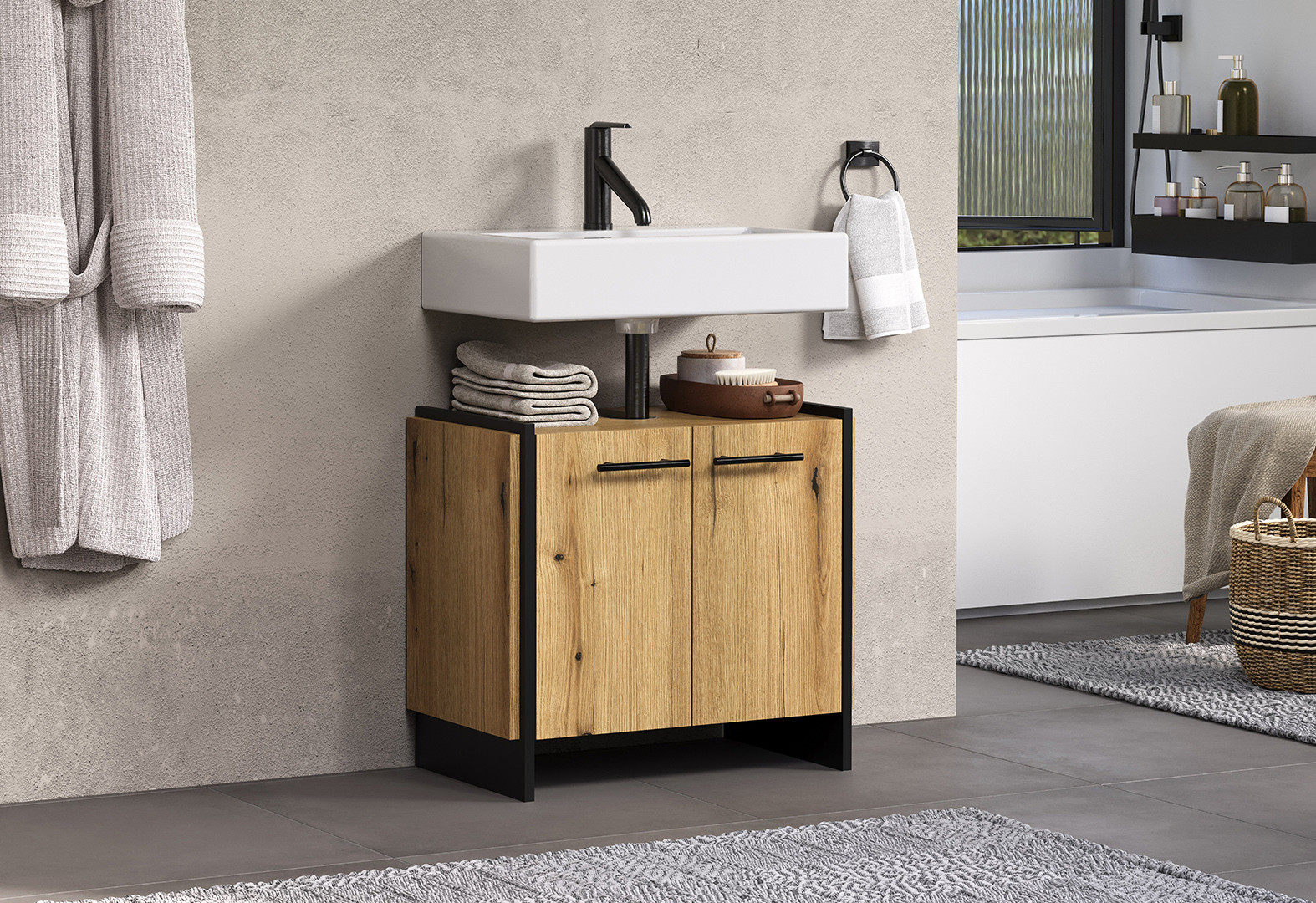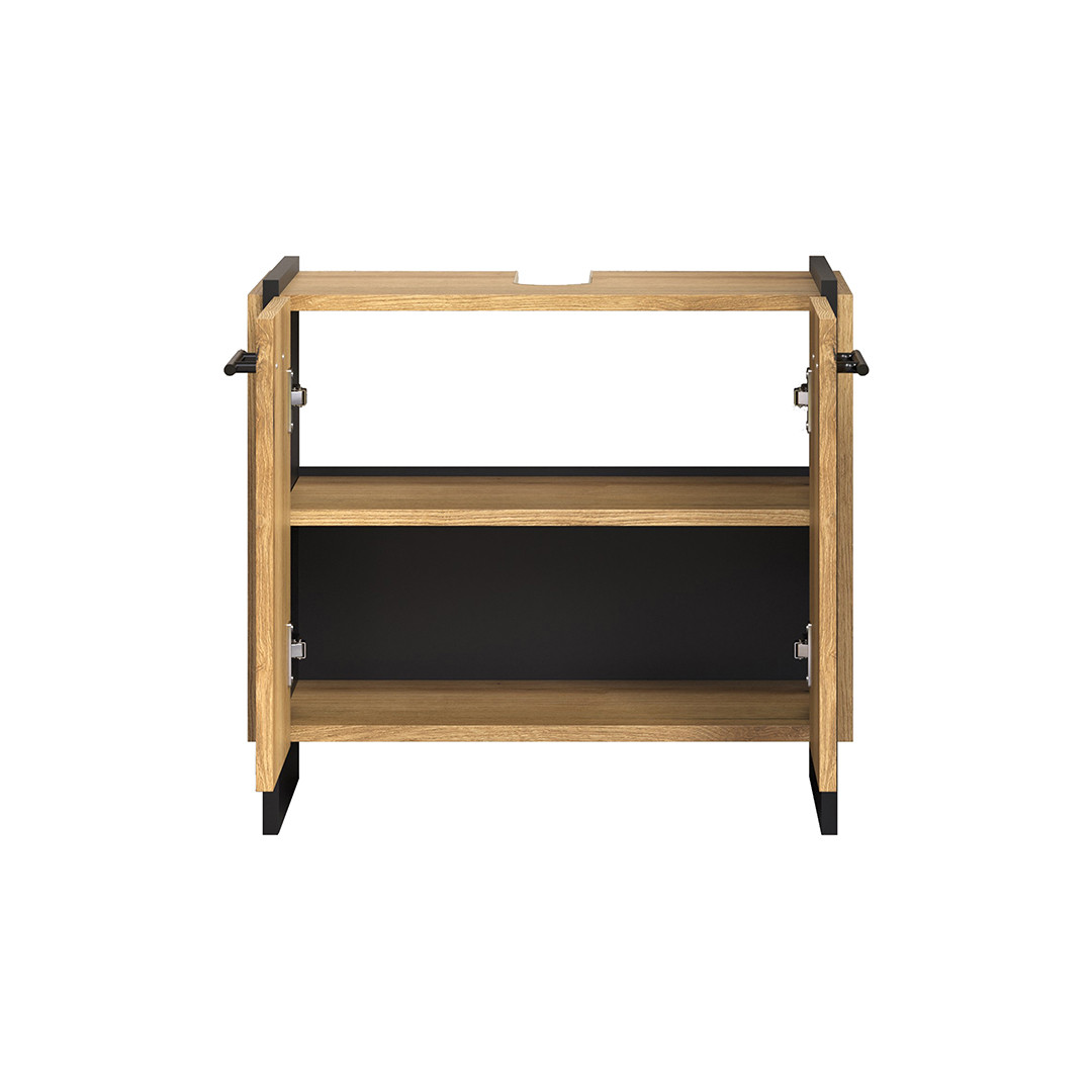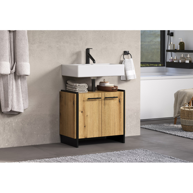 Transformez votre salle de bain en un espace moderne et fonctionnel avec le Saphira, un meuble sous vasque au design contemporain signé Deladeco. Fabriqué en Europe avec des panneaux de particules mélaminés de haute qualité, ce meuble sous vasque de 60 cm de longueur allie élégance et durabilité. Sa finition chêne clair apporte une touche naturelle et chaleureuse qui s'harmonise parfaitement avec tous les styles d'intérieur, qu'ils soient modernes ou plus classiques. Le piétement en bois composite noir crée un contraste sophistiqué qui souligne le caractère unique de ce meuble, tandis que les poignées en métal ajoutent une note industrielle raffinée à l'ensemble.
