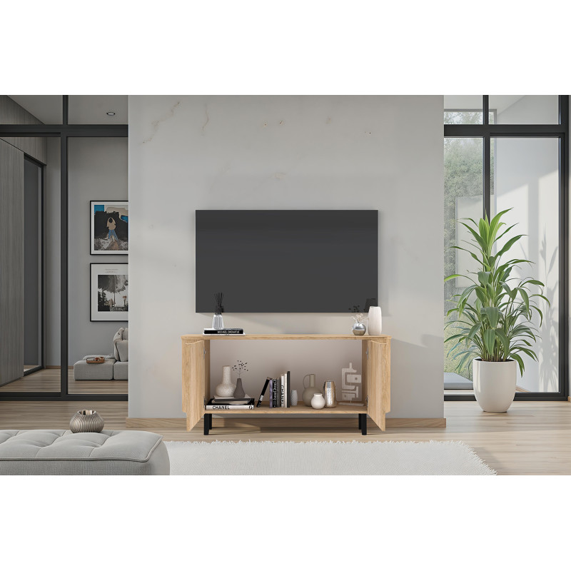 Fabriqué en Italie à partir de panneaux de particules mélaminés de haute qualité de 16 mm, ce meuble tv bénéficie d’une structure solide et durable. Ses angles arrondis en MDF apportent un aspect soigné et sécurisant, tandis que son piétement en métal d’une hauteur de 14 cm assure une excellente stabilité. Avec ses deux portes battantes munies de charnières et de poignées métalliques, ce meuble vous offre un espace de rangement pratique pour dissimuler vos accessoires électroniques, DVD ou magazines tout en conservant un aspect harmonieux et ordonné.