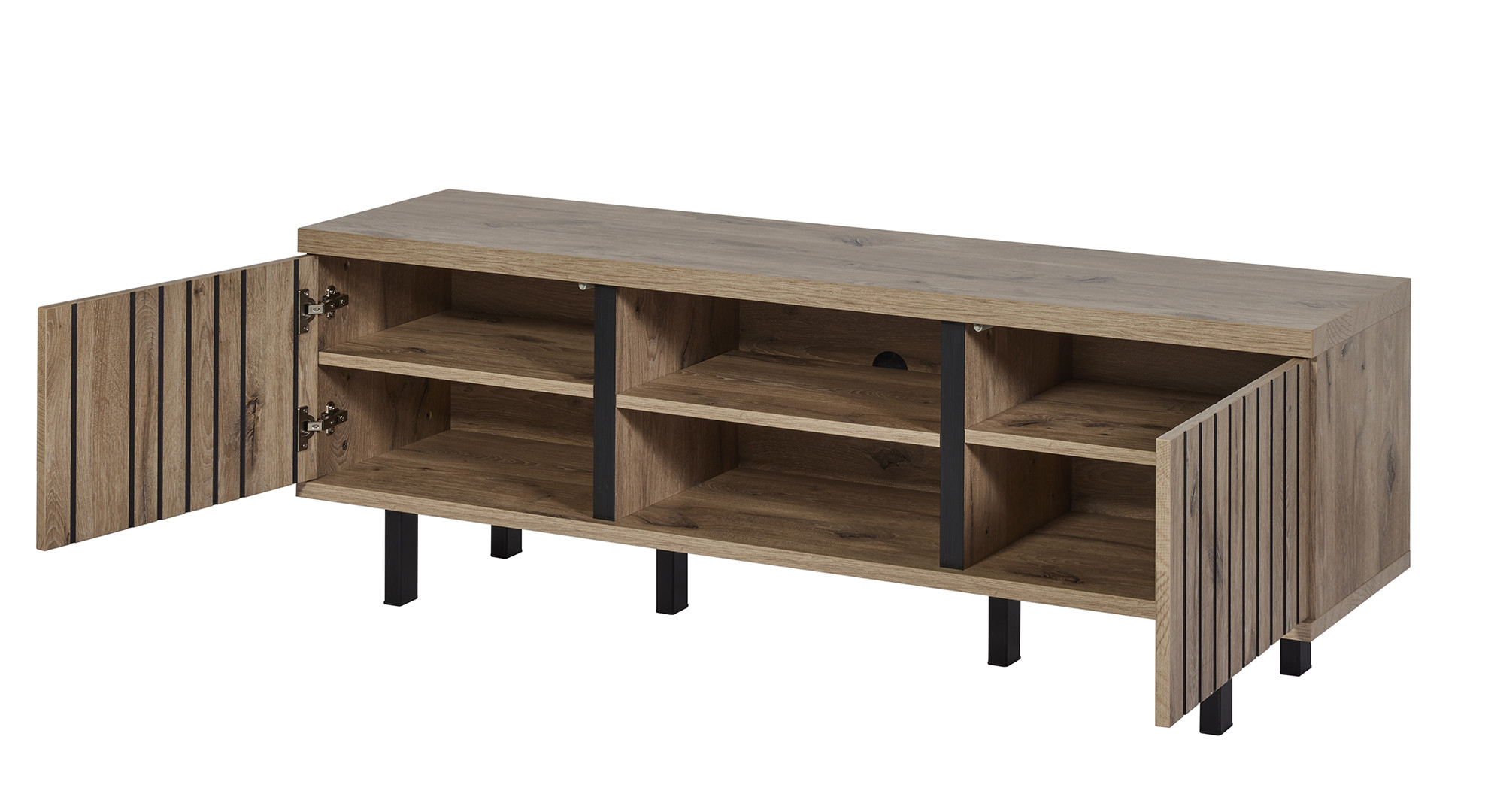 Avec ses deux portes battantes et trois étagères spacieuses, ce meuble TV offre une solution de rangement intelligente pour tout votre équipement audiovisuel. Et ce n'est pas tout ! Son piétement en métal noir ajoute une touche de modernité tout en garantissant une stabilité optimale. Le fini mélaminé lisse et facile à entretenir vous simplifie la vie : un simple coup de chiffon humide suffit pour le garder impeccable jour après jour.
