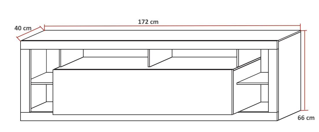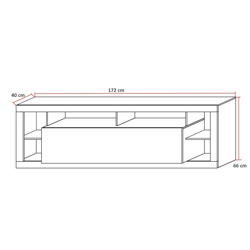 Avec ses dimensions généreuses — 172 cm de longueur, 66 cm de hauteur et 40 cm de profondeur —, ce meuble de salon offre un vaste espace de rangement pour accueillir vos équipements multimédias, vos accessoires et vos objets décoratifs. Son agencement ingénieux, comprenant une porte battante dotée d’un système d’ouverture Soft Closing, garantit un usage confortable et silencieux au quotidien. Le pied arrière en PVC assure une parfaite stabilité, même lorsqu’il est chargé. Ce meuble de salon allie ainsi durabilité, style et praticité pour répondre aux exigences des foyers modernes.