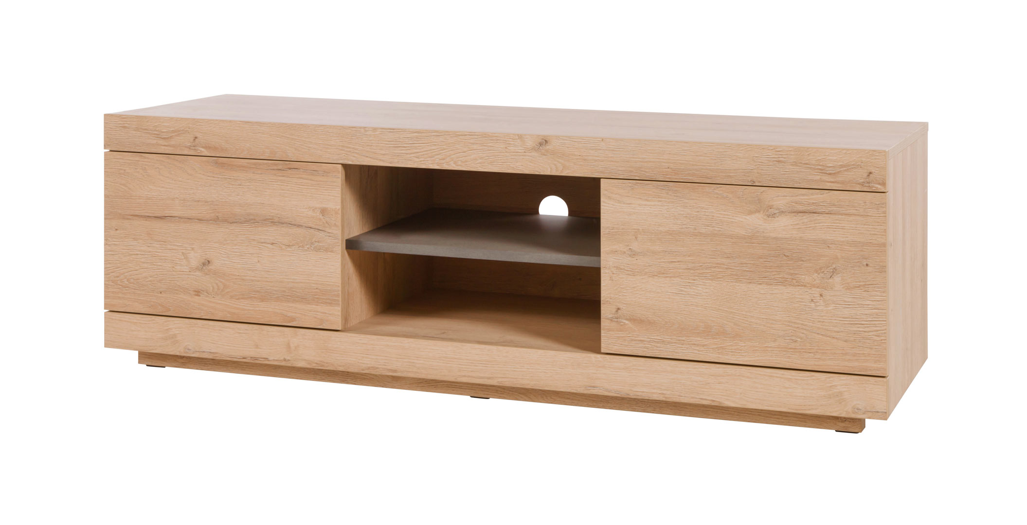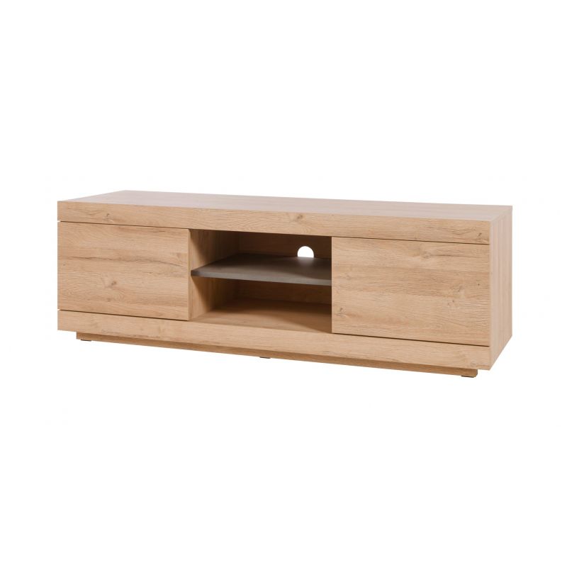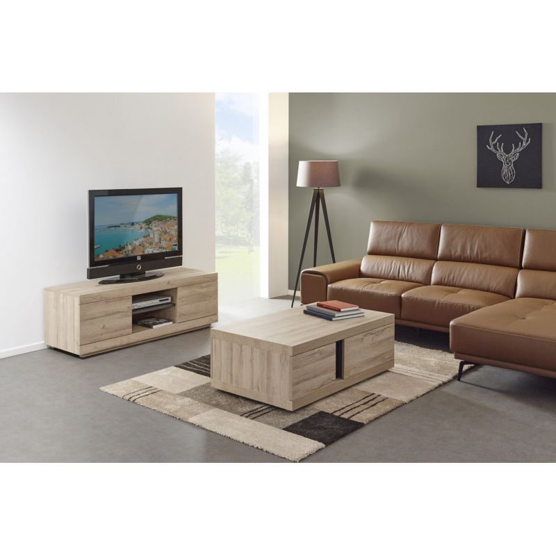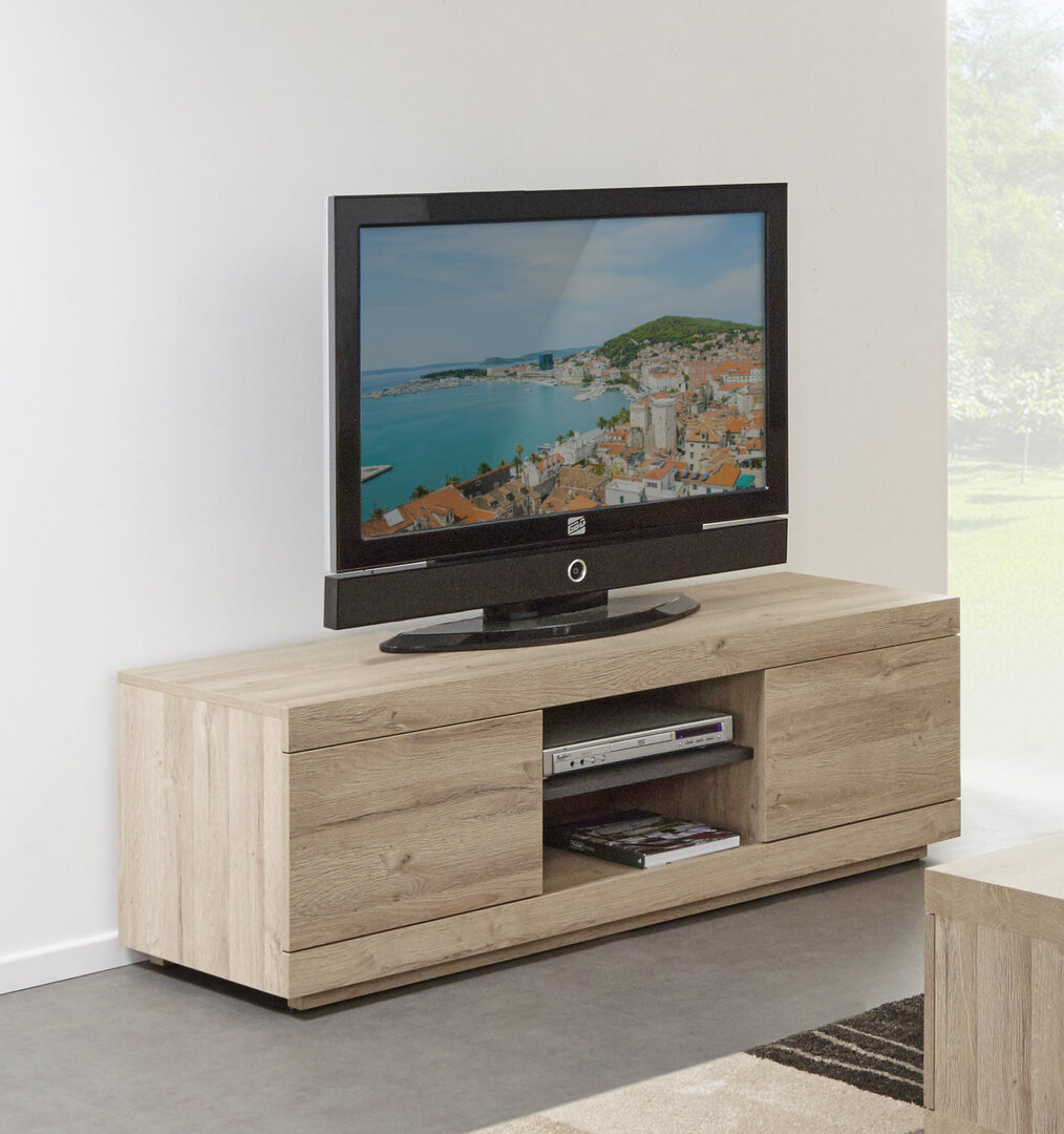 De chaque côté de sa structure en panneaux de particules, vous pourrez profiter de deux rangements optimaux pour les objets de circonférence réduite, comme les magazines et les programmes TV par exemple. Au centre du meuble, un espace a été ménagé pour y installer une box ou une console de jeux vidéo, avec un trou percé à l'arrière pour faciliter les branchements.
