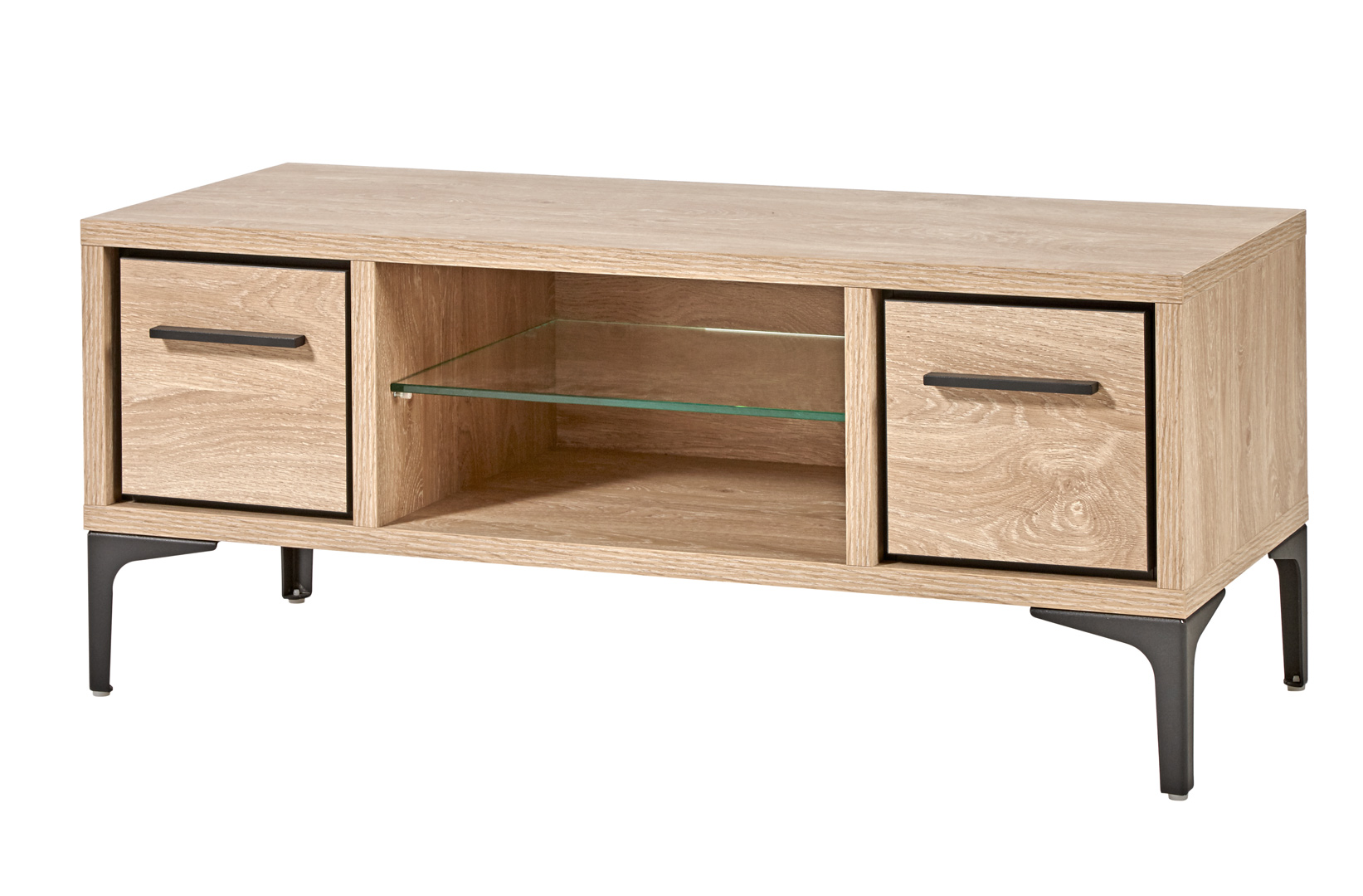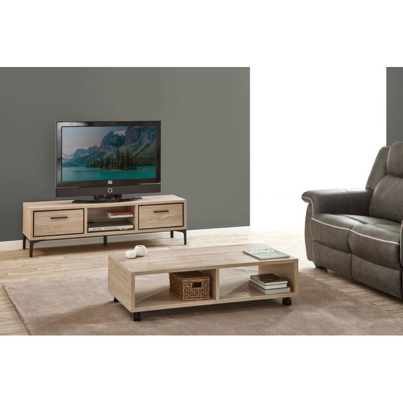 Apportez une touche originale dans votre intérieur avec le meuble TV contemporain Montego. Sa structure est fabriquée en panneaux de particules de première qualité. Il se compose de deux tiroirs montés sur coulisses métalliques et d'une niche centrale avec étagère en verre. Pour un ensemble harmonieux, optez pour les autres éléments de la gamme Montego vendus séparément.