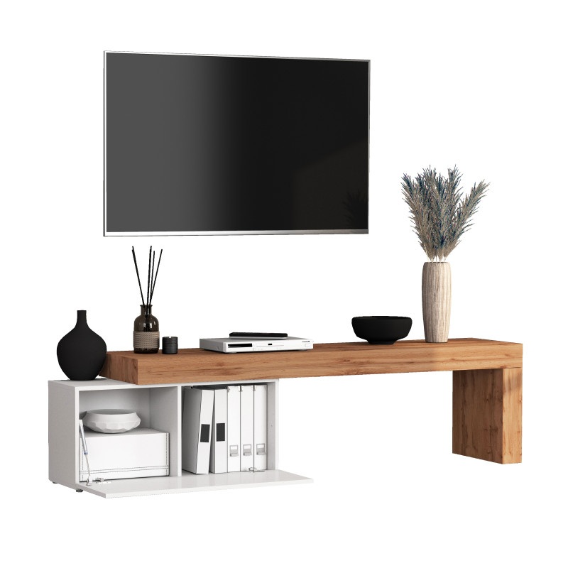 Côté rangement, ce meuble tv contemporain dispose d'une porte battante qui dissimule avec soin vos équipements multimédias, télécommandes et autres accessoires du quotidien. L'organisation de votre meuble de salon devient ainsi un jeu d'enfant, chaque objet trouvant naturellement sa place derrière cette façade épurée. Le design sobre et les lignes droites caractéristiques du style contemporain s'harmonisent aussi bien avec une décoration minimaliste qu'avec un intérieur plus chaleureux aux tonalités bois.