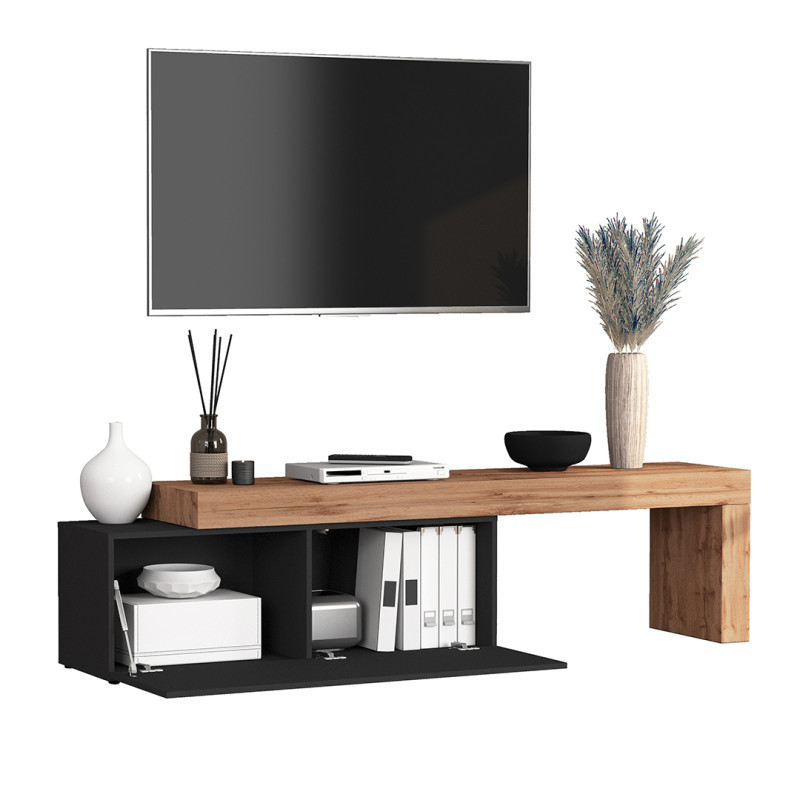 La robustesse de ce meuble tv extensible repose sur une structure en panneaux de particules mélaminés de première qualité, d'une épaisseur de 16 mm, garantissant une excellente résistance dans la durée. Son piétement en PVC assure une stabilité irréprochable, tandis que sa porte battante offre un accès pratique au rangement intérieur. Avec une hauteur de 51 cm et une profondeur de 40 cm, il accueille aisément vos équipements multimédias tout en maintenant une ligne visuelle basse et aérée dans la pièce.