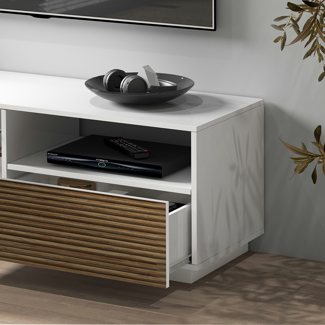 En tant que véritable meuble de salon, le Costarica a été pensé pour répondre aux besoins du quotidien sans sacrifier l'harmonie visuelle de votre pièce. Il dispose de deux portes battantes et d'un tiroir central, offrant ainsi un rangement intelligent et bien organisé pour vos équipements multimédia, télécommandes, câbles et autres accessoires du salon. Ce savant équilibre entre espace de stockage fermé et accessibilité immédiate fait du Costarica un meuble aussi pratique qu'esthétique, capable de s'adapter à toutes les configurations de votre espace de vie.