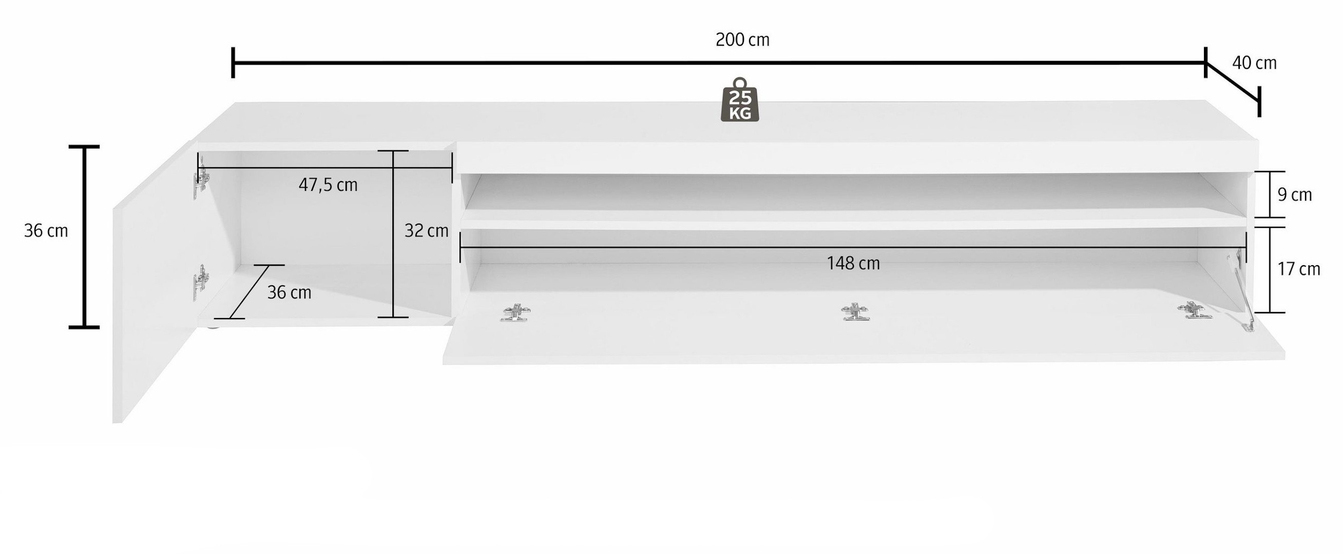 | Structure | Panneaux de particules mélaminés de première qualité 16 mm - corps du meuble blanc mat - façades blanc brillant |