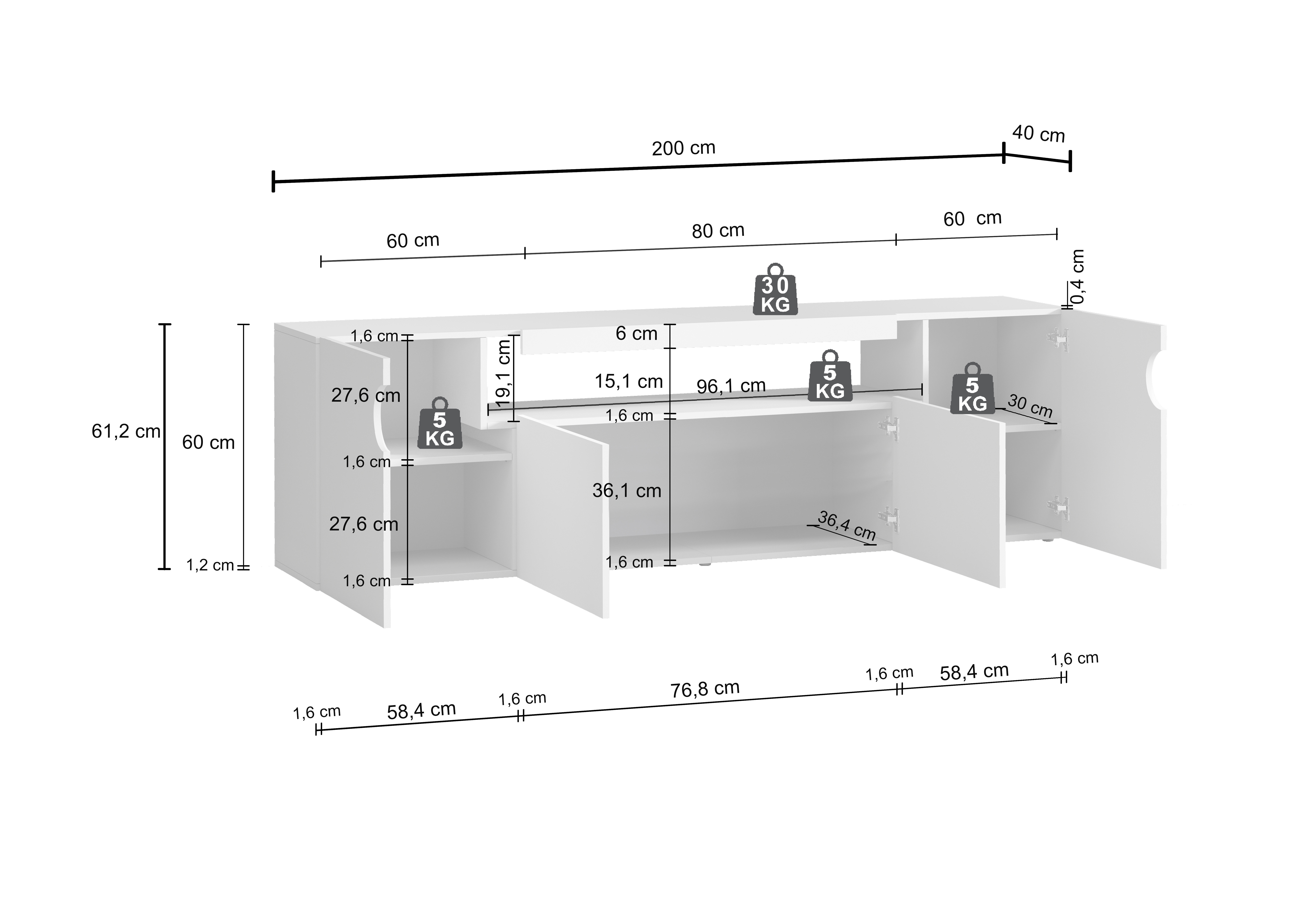 Pensé comme un véritable meuble de salon, le Regina ne se contente pas d'être fonctionnel : il structure et anime l'espace de vie grâce à son option d'éclairage LED intégré, disponible en blanc ou en bleu selon l'ambiance souhaitée. Ses quatre portes battantes dissimulent discrètement câbles, consoles et accessoires pour un intérieur toujours impeccable. Le piétement en PVC garantit une stabilité optimale sur tout type de sol, tandis que la finition mélaminée assure une surface lisse, homogène et résistante aux petits chocs du quotidien.