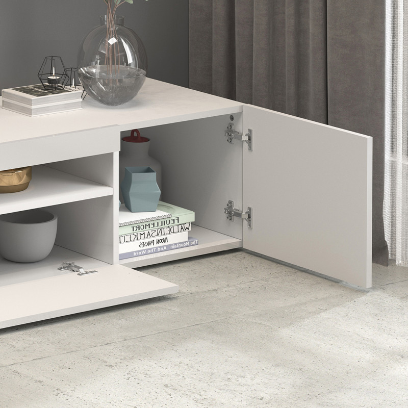 Conçu pour s'intégrer harmonieusement dans un meuble de salon contemporain, ce modèle repose sur une structure robuste en panneaux de particules mélaminés de première qualité de 16 mm d'épaisseur. Le corps du meuble arbore un blanc mat sobre et discret, tandis que les façades en blanc brillant créent un contraste raffiné et moderne. Le piétement en PVC assure une stabilité irréprochable, tout en préservant l'esthétique épurée de l'ensemble. Ce meuble incarne parfaitement l'alliance entre fonctionnalité et design à l'italienne.