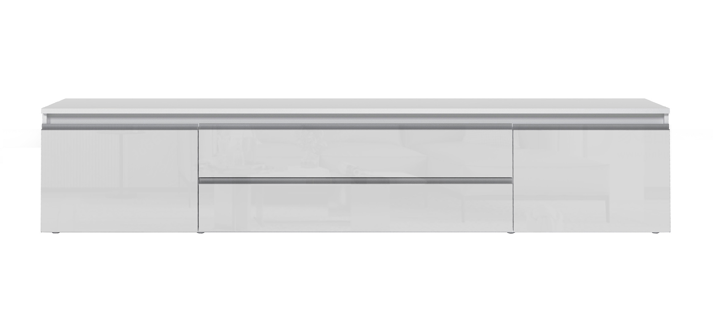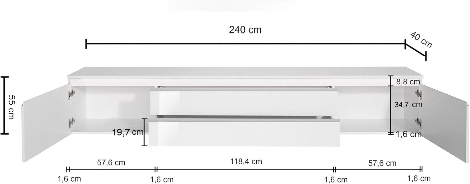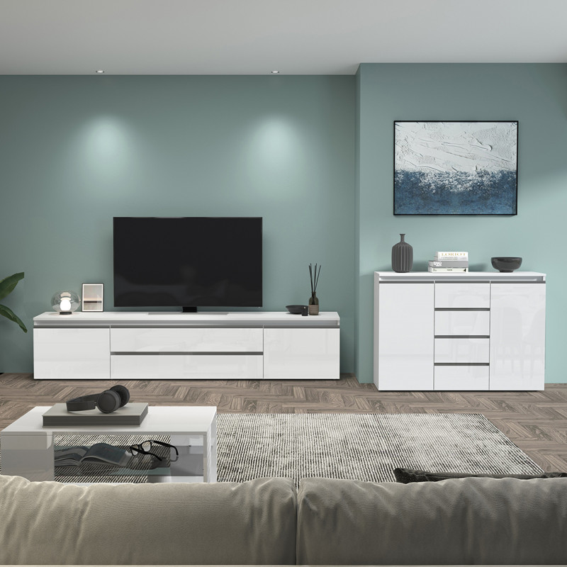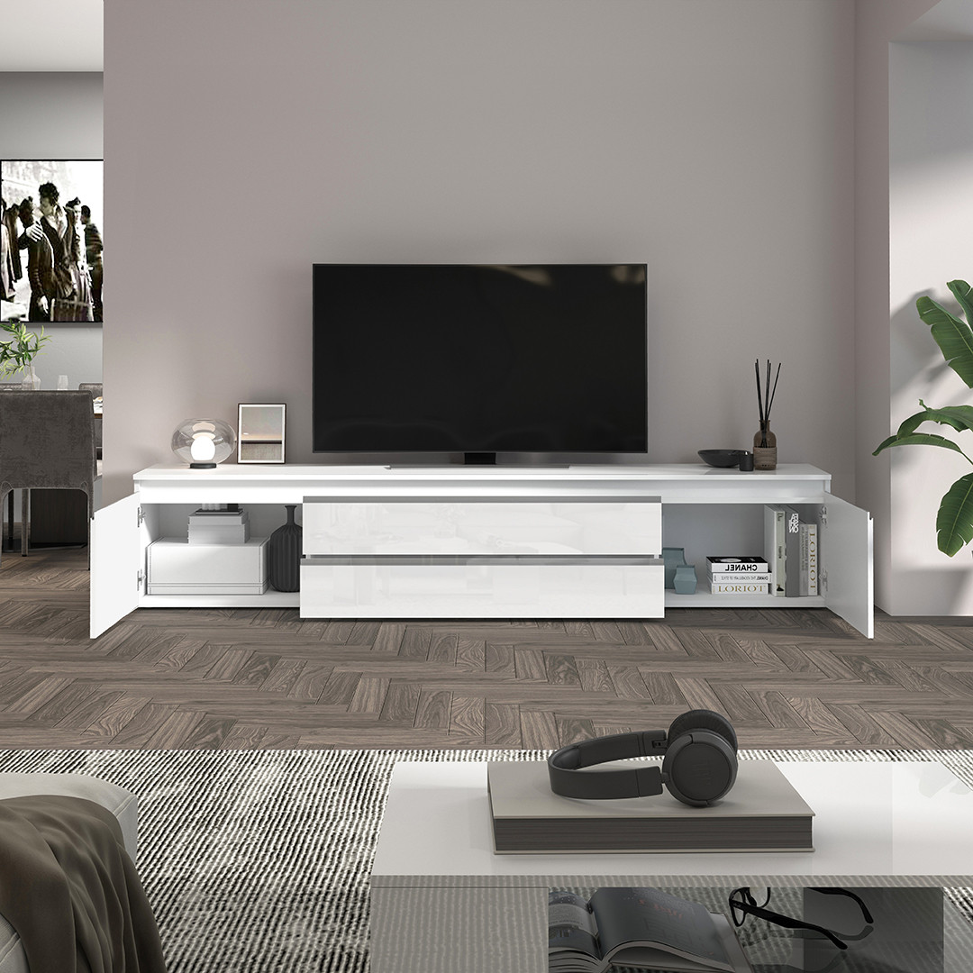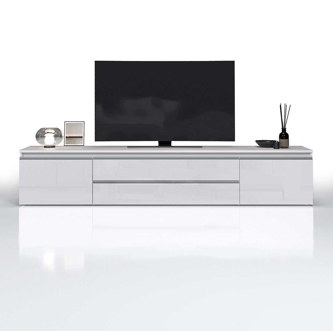Avec ses dimensions généreuses — 240 cm de longueur, 55 cm de hauteur et 40 cm de profondeur — ce meuble de salon offre une capacité de rangement impressionnante tout en conservant une silhouette fine et épurée. Il dispose de 2 portes battantes et de 2 tiroirs pratiques, permettant de ranger télécommandes, câbles, consoles et autres accessoires multimédias en toute discrétion. Les poignées en aluminium ajoutent une note design et contemporaine, tandis que le piétement en PVC assure une stabilité optimale sur tous types de sols.