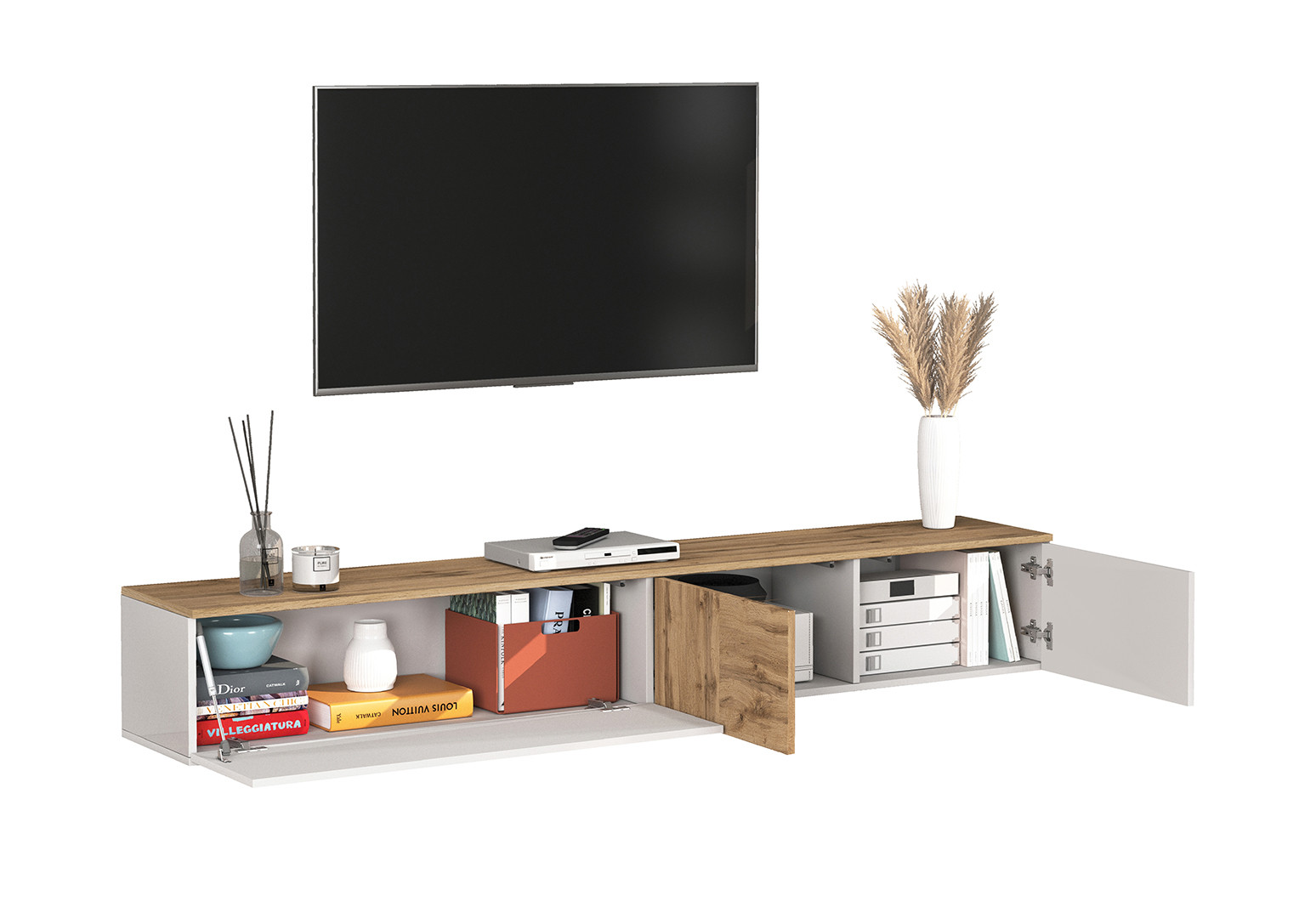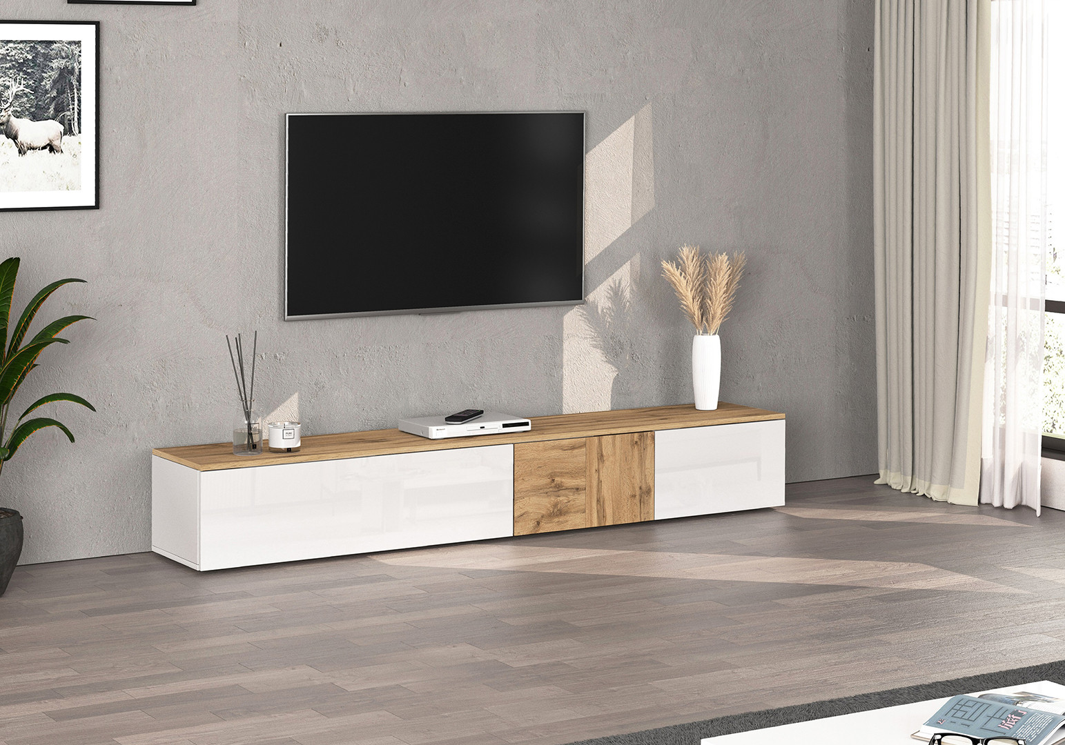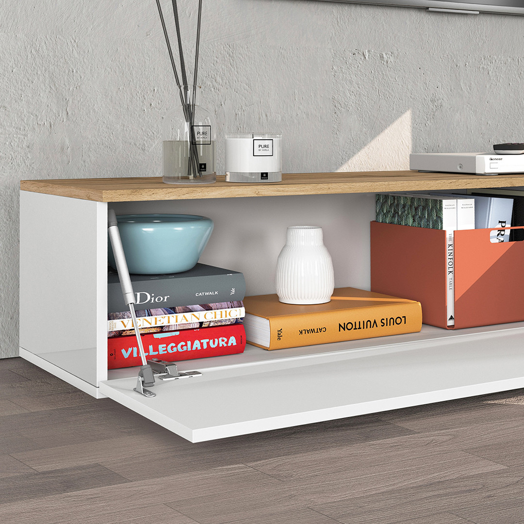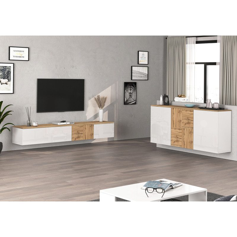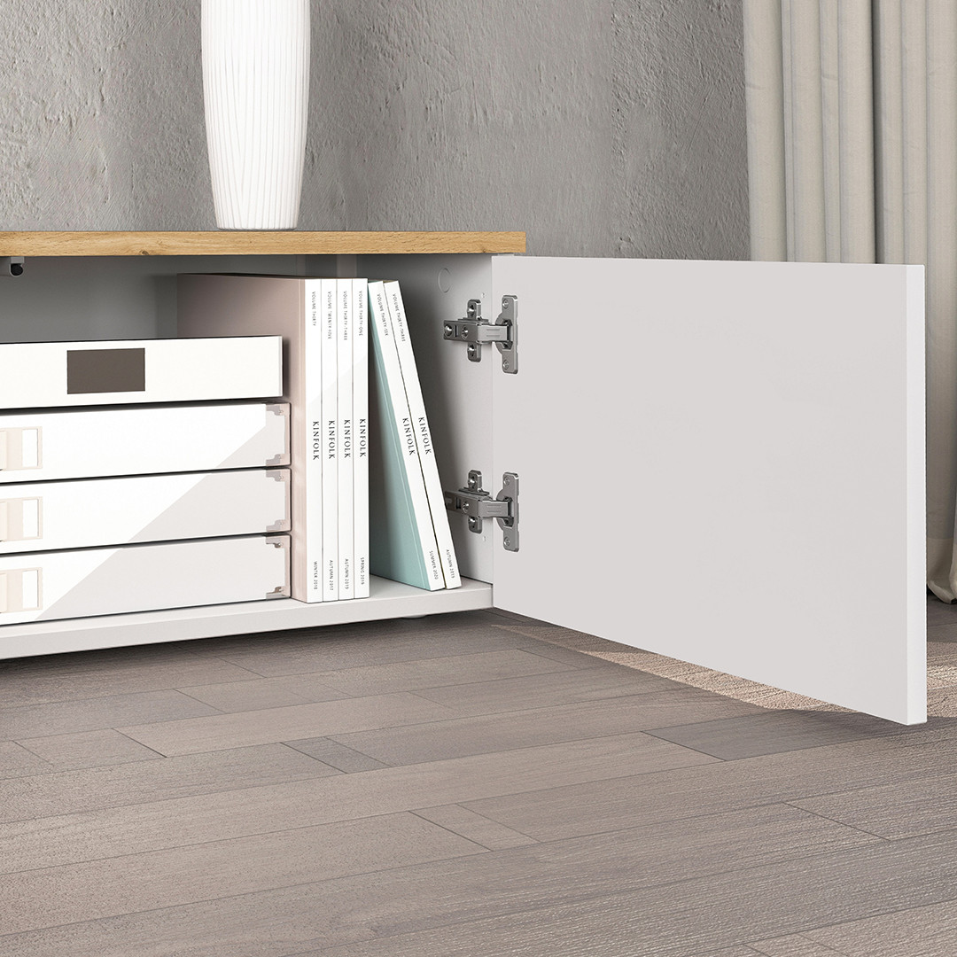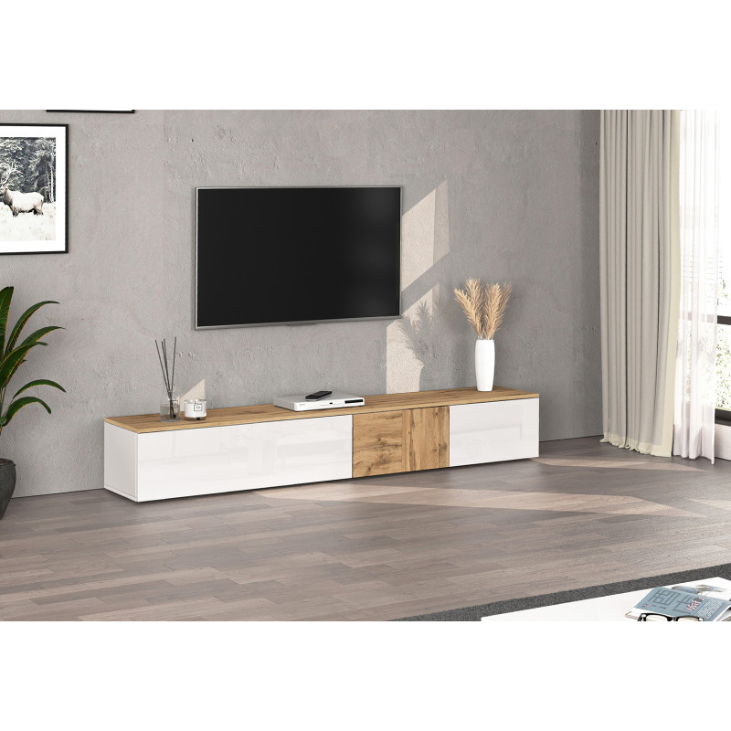 Son coloris blanc brillant associé au chêne wotan lui confère un caractère résolument moderne et chaleureux à la fois. Ce meuble tv aux finitions mélaminées soignées résiste aux rayures et à l'usure du temps, garantissant un rendu impeccable sur le long terme. Les trois portes battantes offrent un rangement discret et pratique pour vos équipements multimédia, décodeurs, consoles de jeux et autres accessoires du quotidien, tout en maintenant une façade épurée et ordonnée.