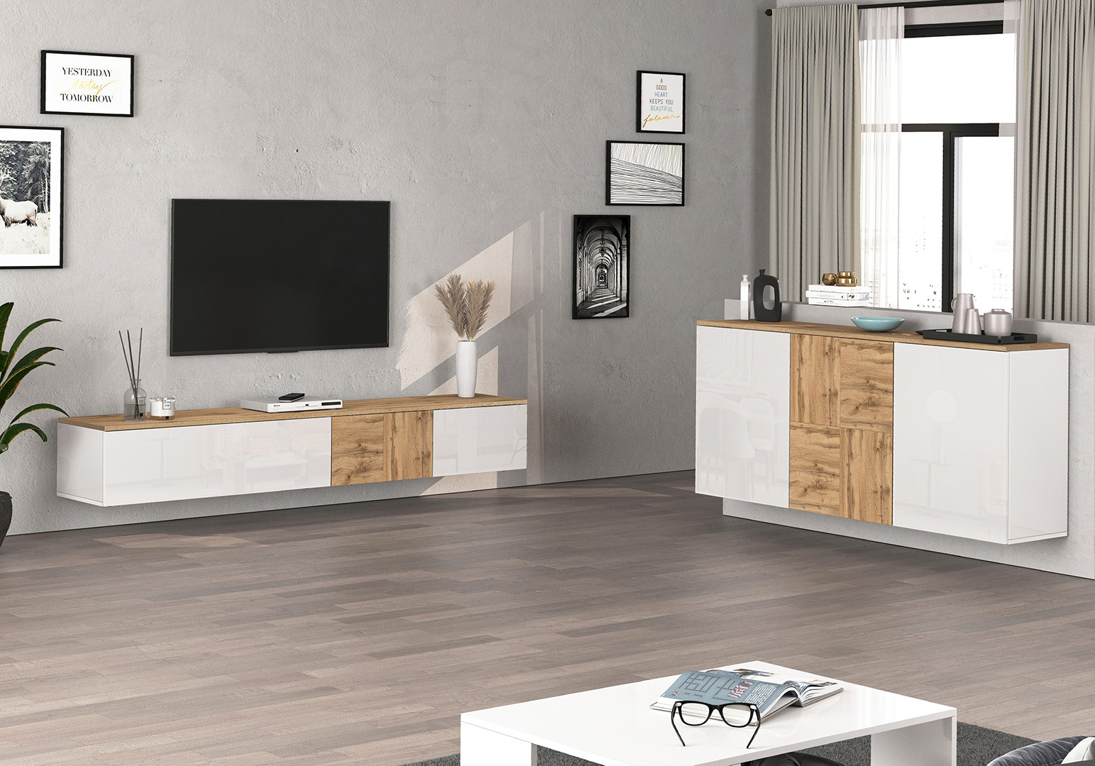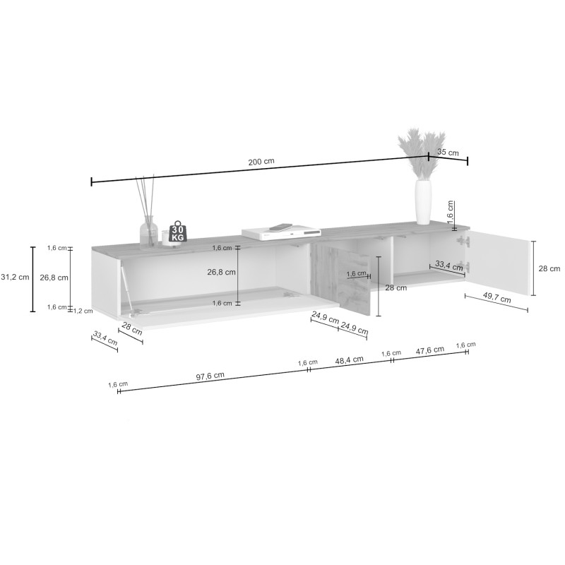 L'un des atouts majeurs de ce meuble de salon réside dans sa double polyvalence d'installation : il peut être fixé au mur pour un effet suspendu ultra-tendance, dégageant ainsi le sol et facilitant l'entretien, ou simplement posé au sol selon vos préférences et la configuration de votre pièce. Le piétement en PVC assure une stabilité optimale dans les deux cas d'usage. Cette flexibilité en fait une solution idéale pour tous types d'intérieurs, qu'il s'agisse d'un appartement moderne ou d'une maison contemporaine.