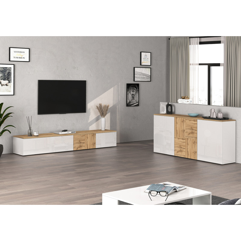 | Buffet/bahut moderne 200 cm blanc brillant/chêne wotan Isayane | | Longueur: 200 cm Hauteur: 70 cm Profondeur: 35 cm | En stock 48 à 72h | 395 € 00 | ||