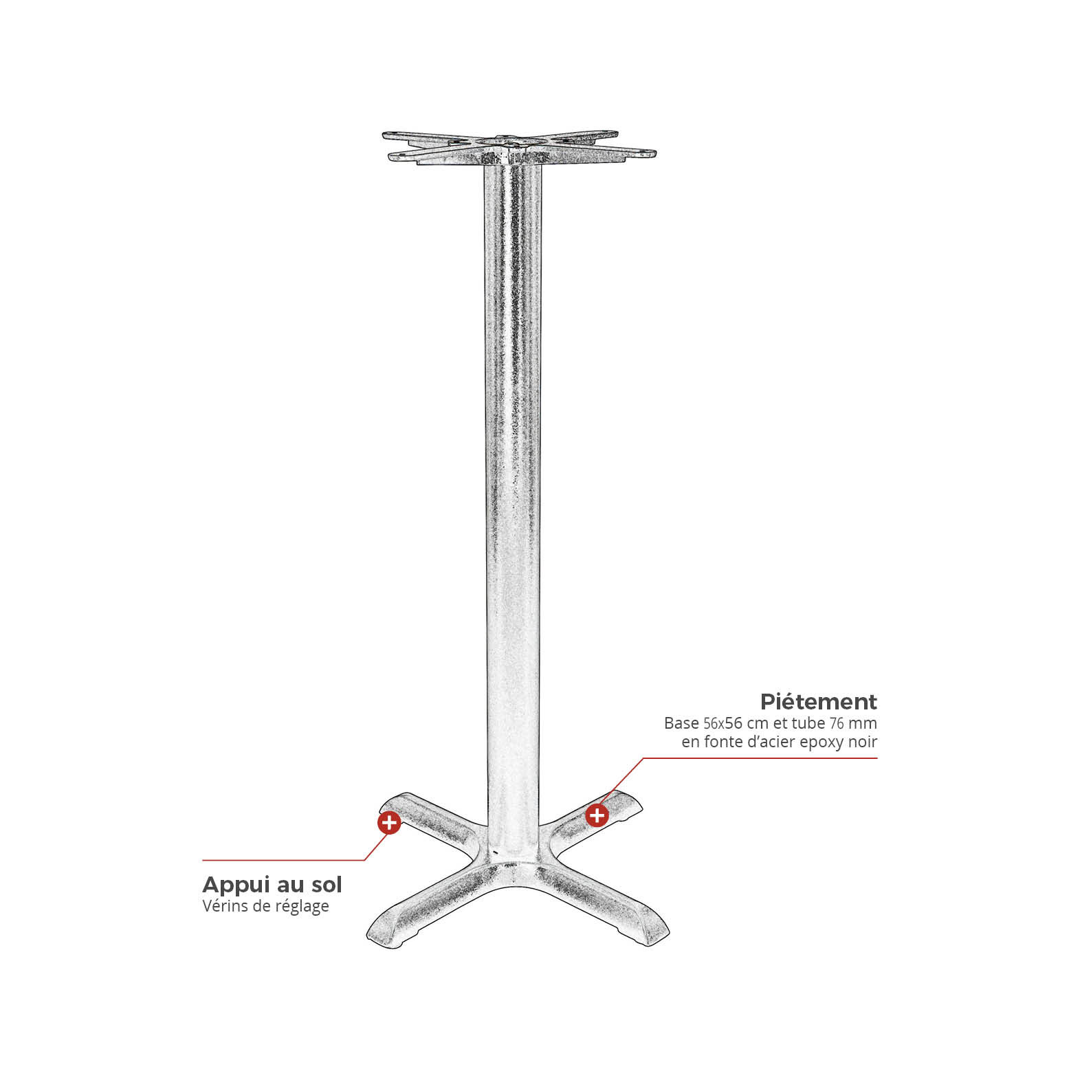 | Structure | Fonte d’acier Ø 76 mm epoxy noir mat - vérins de réglage |