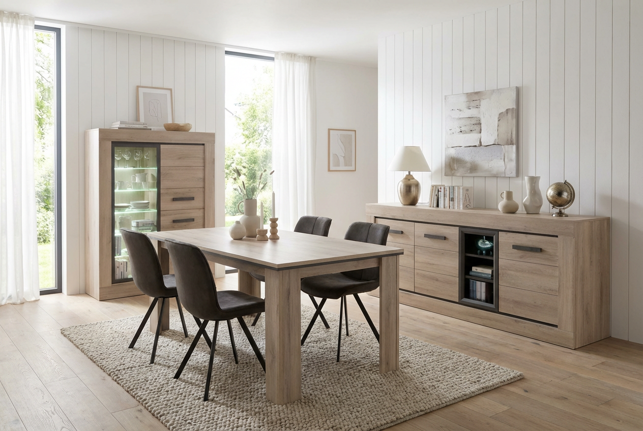 Le buffet a été pensé pour simplifier votre quotidien. Il offre un espace de rangement généreux pour organiser vaisselle, nappes ou autres accessoires essentiels, tout en mettant en valeur vos plus beaux objets grâce à sa niche ouverte. Côté table, ses dimensions accueillantes en font une alliée des repas conviviaux, qu’ils soient quotidiens ou festifs. Chaque pièce de cet ensemble séduit par ses finitions soignées et son entretien facile, conçu pour répondre aux besoins des foyers d’aujourd’hui. Laissez-vous charmer par cette salle à manger contemporaine, à la fois esthétique et fonctionnelle.