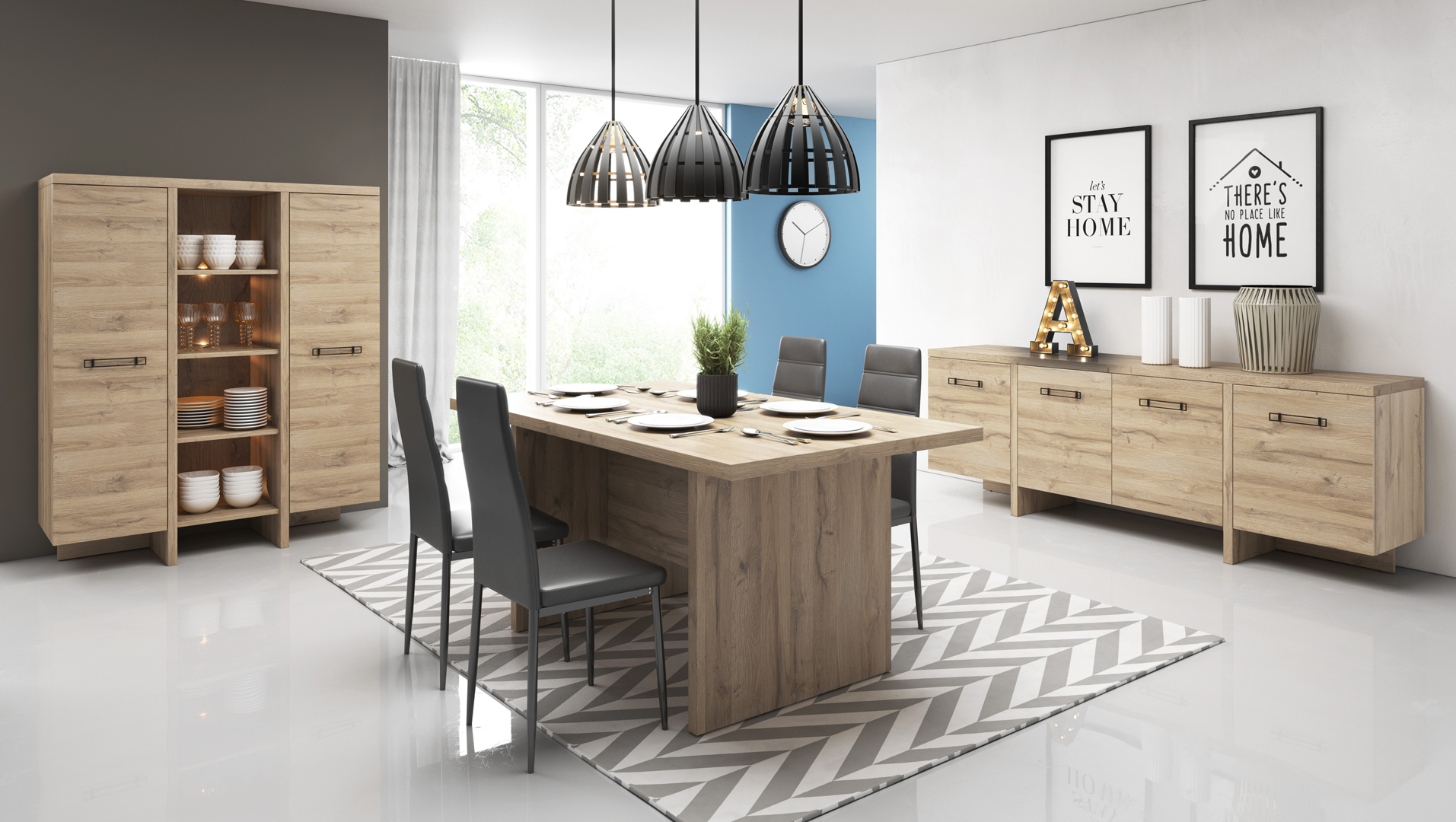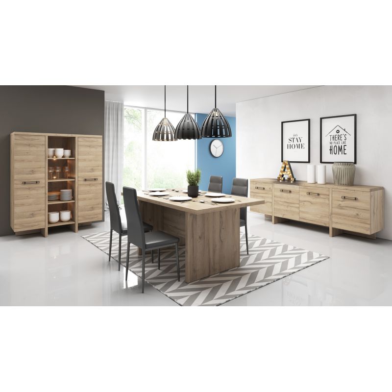 La salle à manger contemporaine Jason se compose de trois éléments : un buffet/bahut 4 portes, un vaisselier/argentier et une table rectangulaire.
