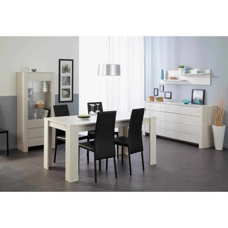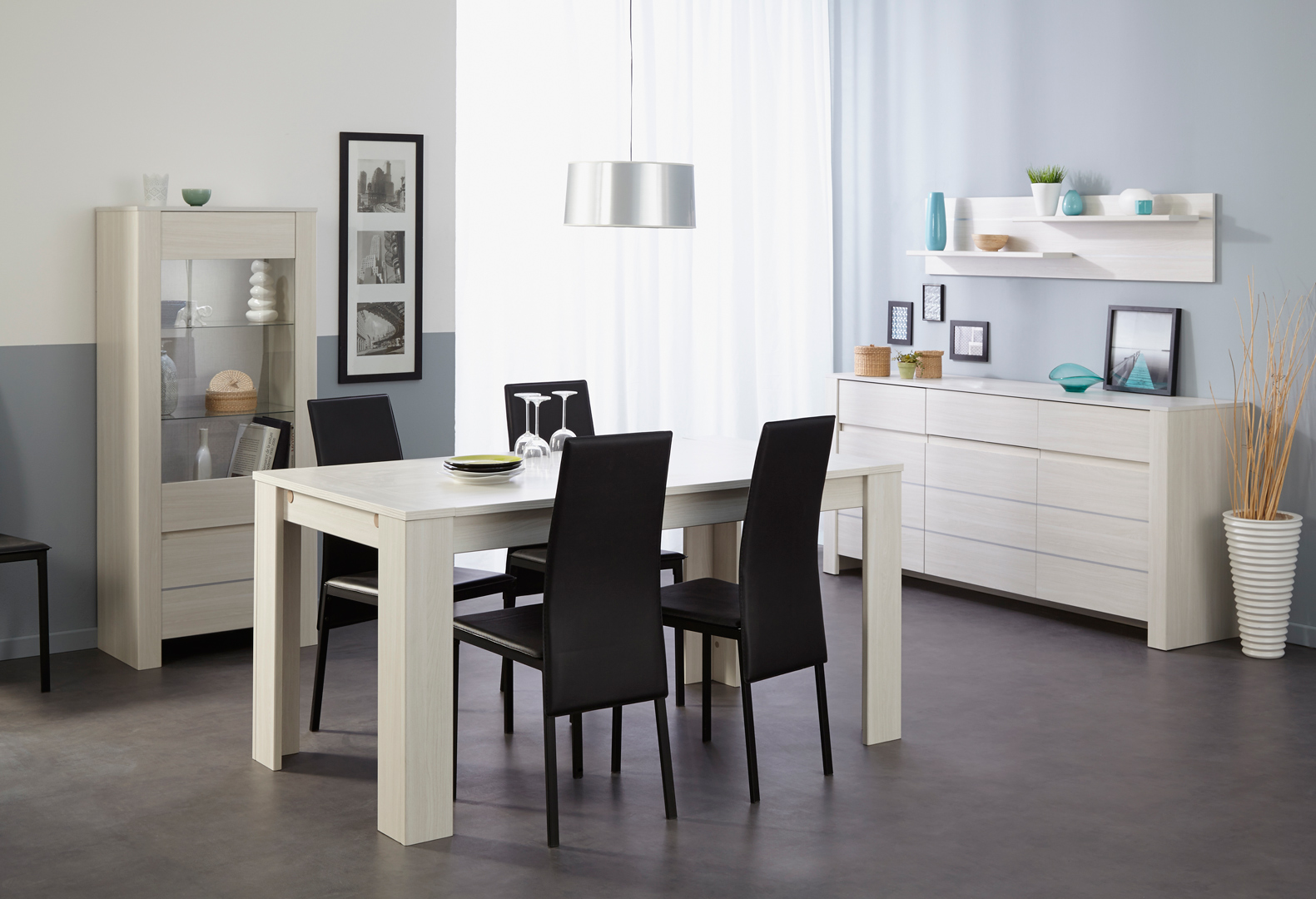 La salle à manger contemporaine Dauphine vous charmera par son coloris harmonieux et ses lignes parfaites. Sa structure est fabriquée en panneaux de particules de première qualité de 16 et 22 mm d'épaisseur. Les montants sont en MDF enrobé. Les portes sont dotées d'ouverture prise de main. Elle se compose de 3 éléments : un vaisselier/argentier, un buffet/bahut 3 portes/1 tiroir et une table rectangulaire. Les tiroirs sont montés sur coulisses métalliques. Il vous sera possible d'ajouter une allonge de 44 cm (vendue séparément) à chaque extrémité de la table. Pour un ensemble harmonieux, optez pour les autres éléments de la gamme Dauphine vendus séparément.