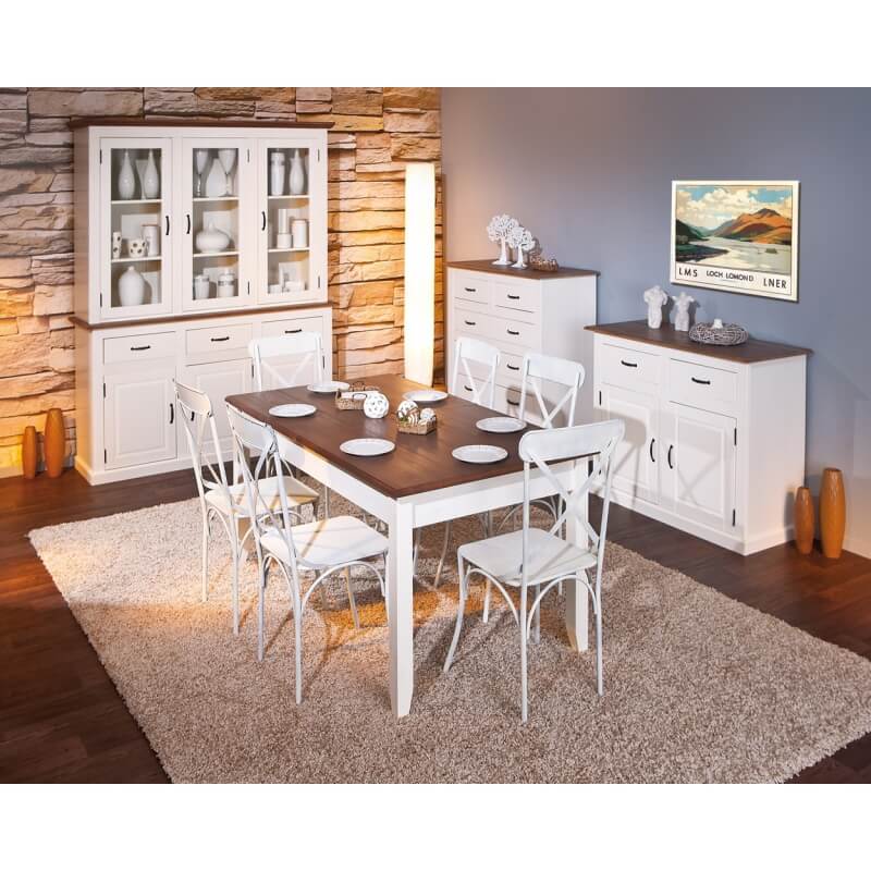 La salle à manger contemporaine Sepia apportera une touche lumineuse dans votre intérieur. Sa structure est fabriquée à partir de bois de plantation renouvelé. Elle se compose de 4 éléments : une vitrine 6 portes/3 tiroirs, un meuble de rangement 6 tiroirs, un meuble de rangement 2 portes/2 tiroirs et une table rectangulaire extensible. Les tiroirs des meubles sont montés sur coulisses métalliques. L'allonge de la table est également montée sur coulisses métalliques. Pour un ensemble harmonieux, optez également pour les autres éléments de la gamme Sepia vendus séparément.