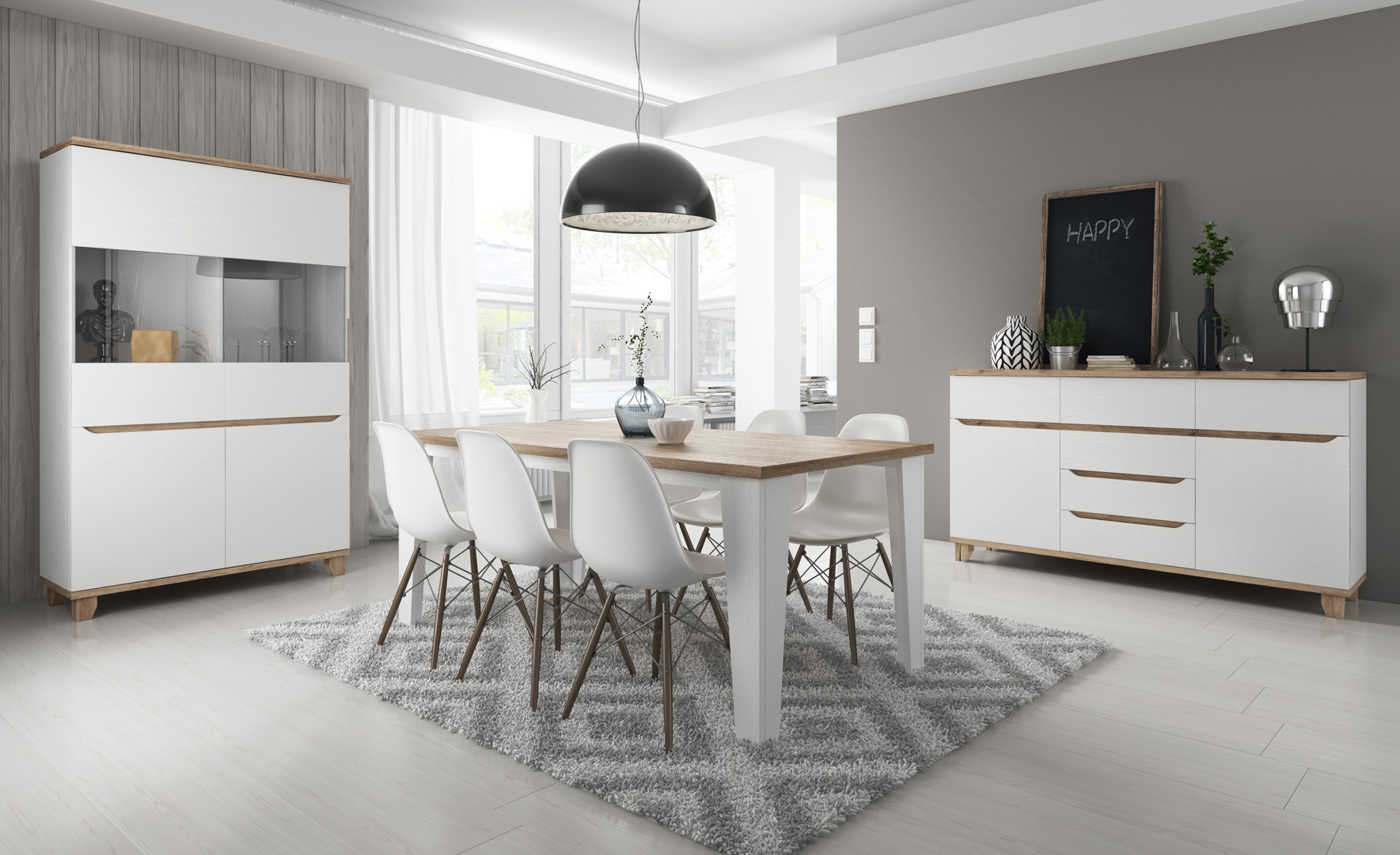 La salle à manger contemporaine Mélanie II vous séduira par son charme scandinave facile à vivre. Sa structure est fabriquée en panneaux de particules mélaminés de première qualité. Elle se compose de trois éléments : une vitrine 2 portes, un buffet/bahut 2 portes/3 tiroirs et une table rectangulaire en 160 ou 180 cm. Pour un ensemble harmonieux, optez également pour les autres éléments de la gamme Mélanie vendus séparément.