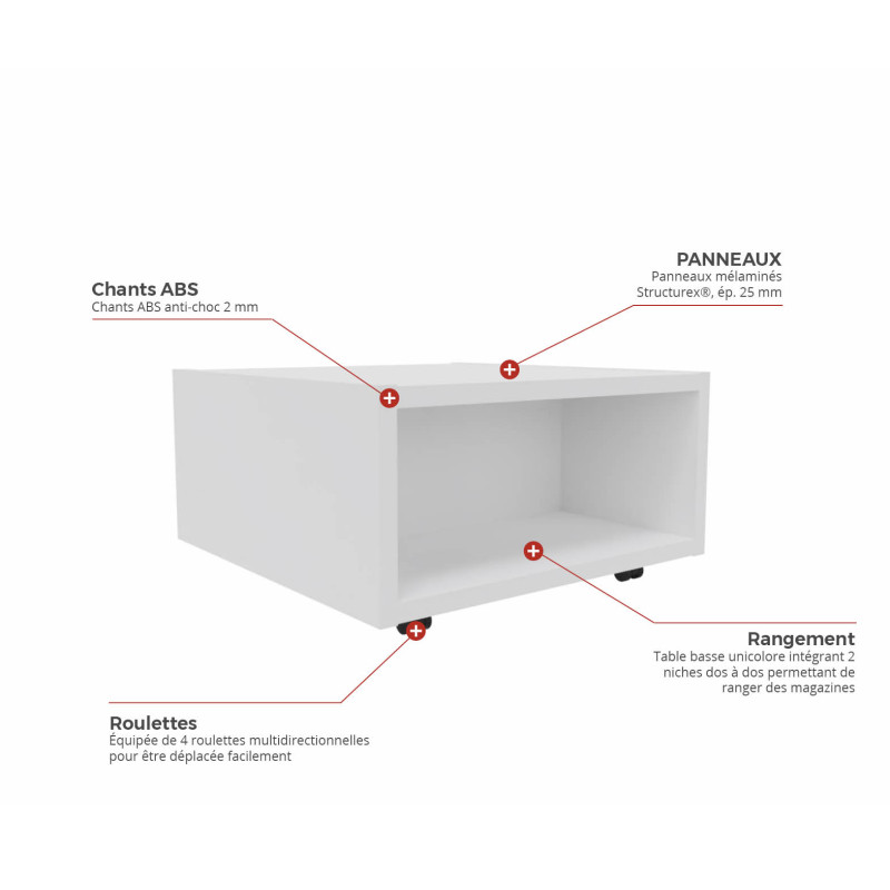 Mais que diriez-vous d'une table basse carrée qui s'occupe aussi de votre confort ? Imaginez ranger magazines et documents dans ses deux niches dos à dos, un vrai jeu d'enfant. Son plateau en panneau mélaminé Structurex® de 25 mm d'épaisseur, renforcé par des chants ABS anti-choc, est conçu pour résister à l'épreuve du temps et de l'usage intensif. Et pour la nettoyer ? Un simple chiffon doux et humide suffira.