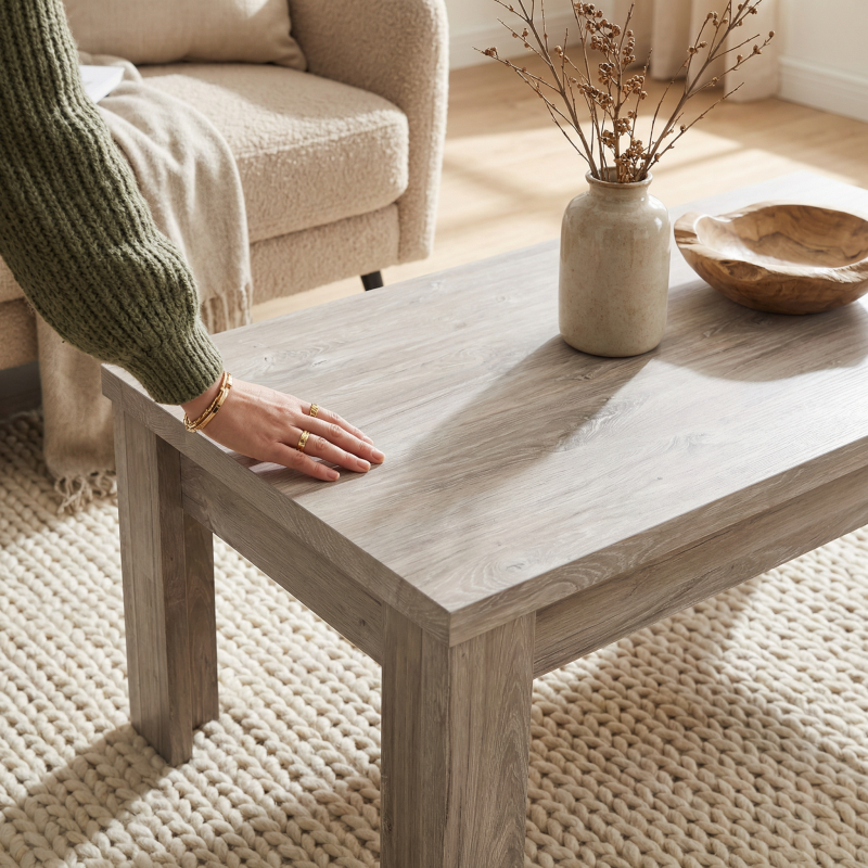 Envie d’ajouter une touche chic à votre salon contemporain? La table basse Oliviera signée Deladeco est le choix parfait ! Conçue en Belgique, elle allie design moderne et fonctionnalité pratique. Avec sa structure en panneaux de particules haut de gamme et sa finition chêne gris, cette table rectangulaire s’adapte avec style à n’importe quel espace de vie. Grâce à ses dimensions généreuses de 120 cm de long, 60 cm de large et 40 cm de haut, elle offre tout l’espace nécessaire pour vos magazines, télécommandes ou objets de déco favoris.