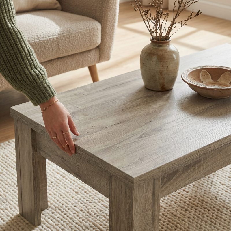 Avec ses dimensions de 120 cm de longueur, 59 cm de profondeur et 40 cm de hauteur, cette table rectangulaire s’intègre parfaitement, que ce soit dans un salon contemporain ou un espace plus classique. Elle pèse 21 kg, ce qui la rend facile à déplacer tout en assurant une excellente stabilité pour vos objets décoratifs ou vos moments de détente. La finition en mélamine assure non seulement une esthétique soignée mais aussi une résistance durable aux rayures et taches du quotidien.