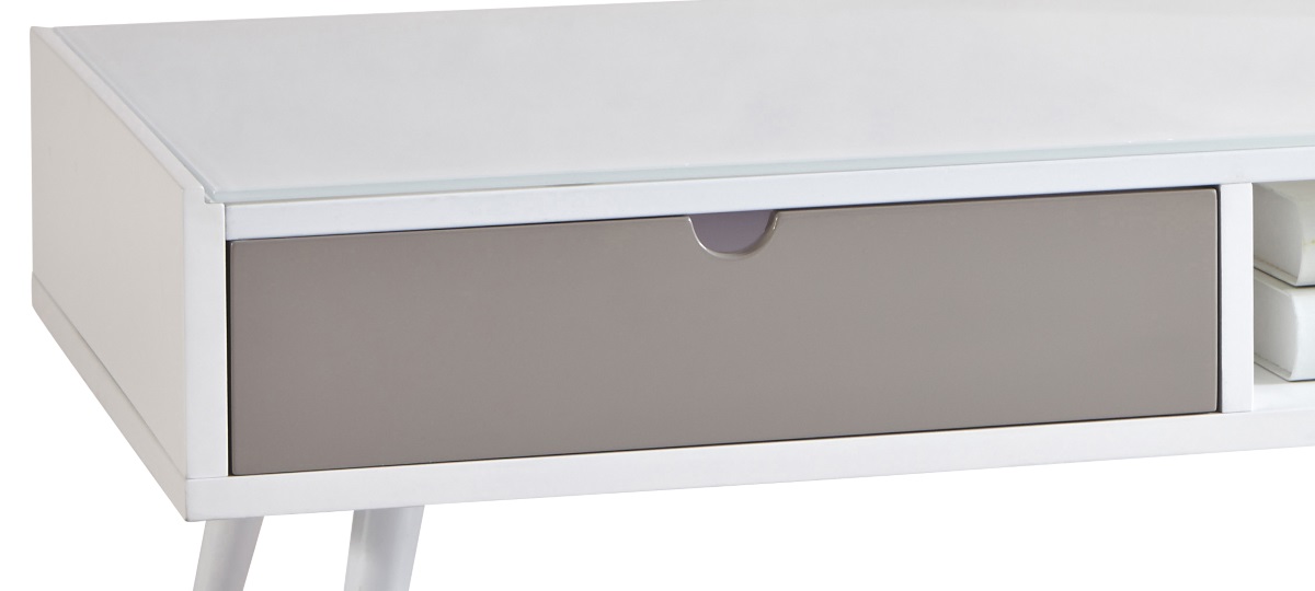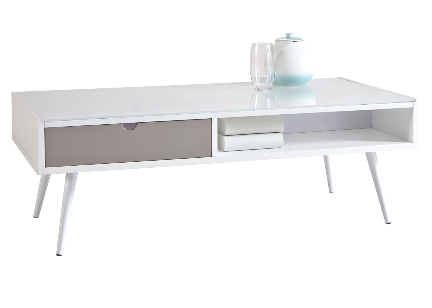 La table basse design Agora apportera une touche raffinée et lumineuse dans votre salon grâce au mélange audacieux des matières et des coloris. Sa structure en MDF de 18 mm d'épaisseur accueille un plateau en verre sécurit de 6 mm d'épaisseur. Ses pieds en métal de 23,8 mm de diamètre garantiront une parfaite stabilité. Le tiroir en façade vous permettra de ranger soigneusement vos magazines.