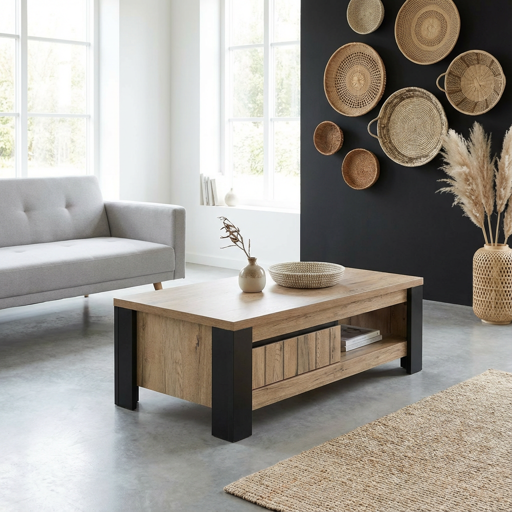 Pratique et stylée, cette table basse est idéale pour un usage quotidien. Elle dispose d’un tiroir discret où vous pouvez ranger magazines, télécommandes ou autres petits objets. Pesant 37 kg, elle offre une stabilité solide tout en apportant une chaleur naturelle grâce à sa finition en décor chêne. Avec une hauteur de 60 cm, elle est parfaitement dimensionnée pour vos moments de détente, vous permettant d’avoir tout ce dont vous avez besoin à portée de main.