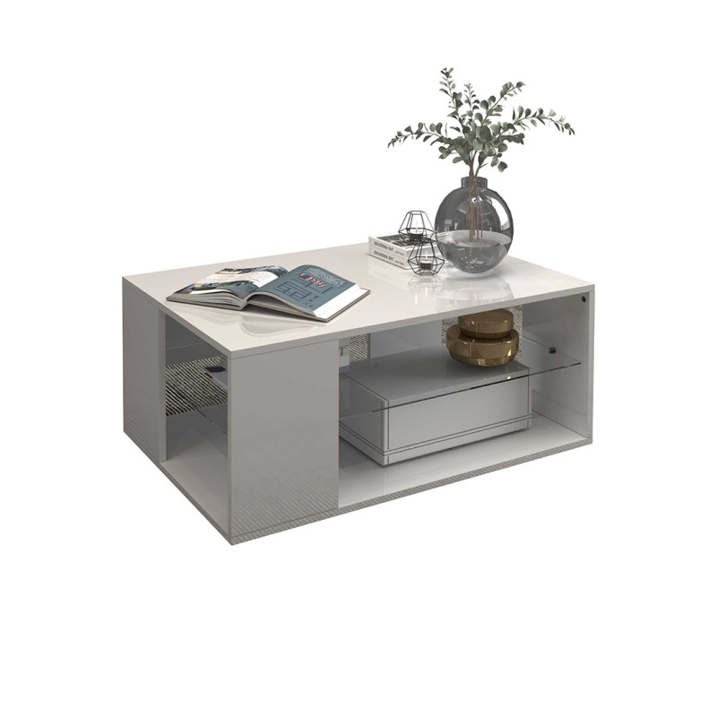 La qualité de fabrication est au cœur de ce produit : la structure est composée de panneaux de particules mélaminés de première qualité de 16 mm d'épaisseur, garantissant une solidité et une durabilité exemplaires. En tant que véritable table de salon pensée pour un usage particulier, elle repose sur un piétement en PVC stable et discret, qui accompagne subtilement le design général sans en altérer la pureté visuelle. La finition mélaminée blanc brillant confère à l'ensemble un aspect laqué haut de gamme, reflétant la lumière ambiante pour apporter luminosité et volume à votre pièce de vie.