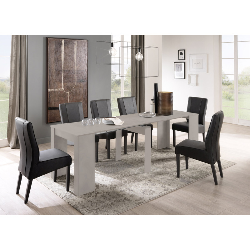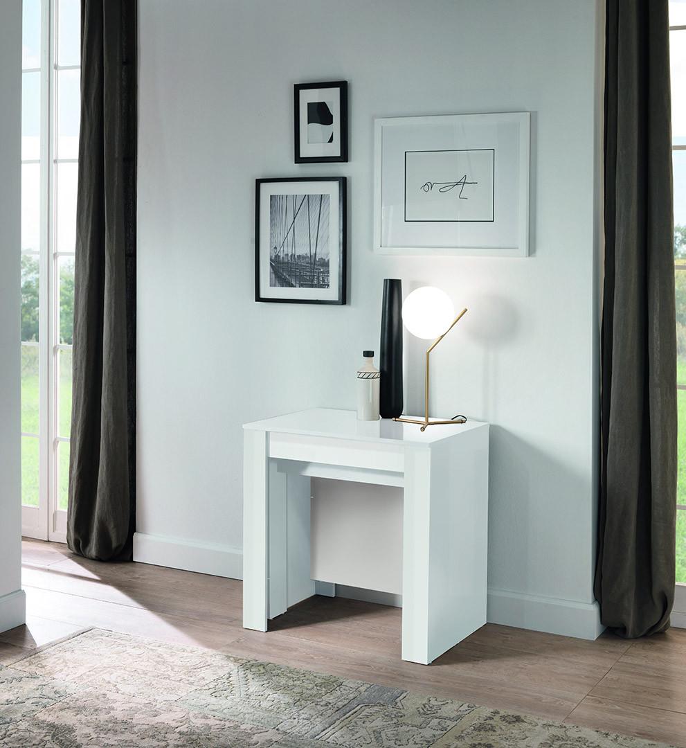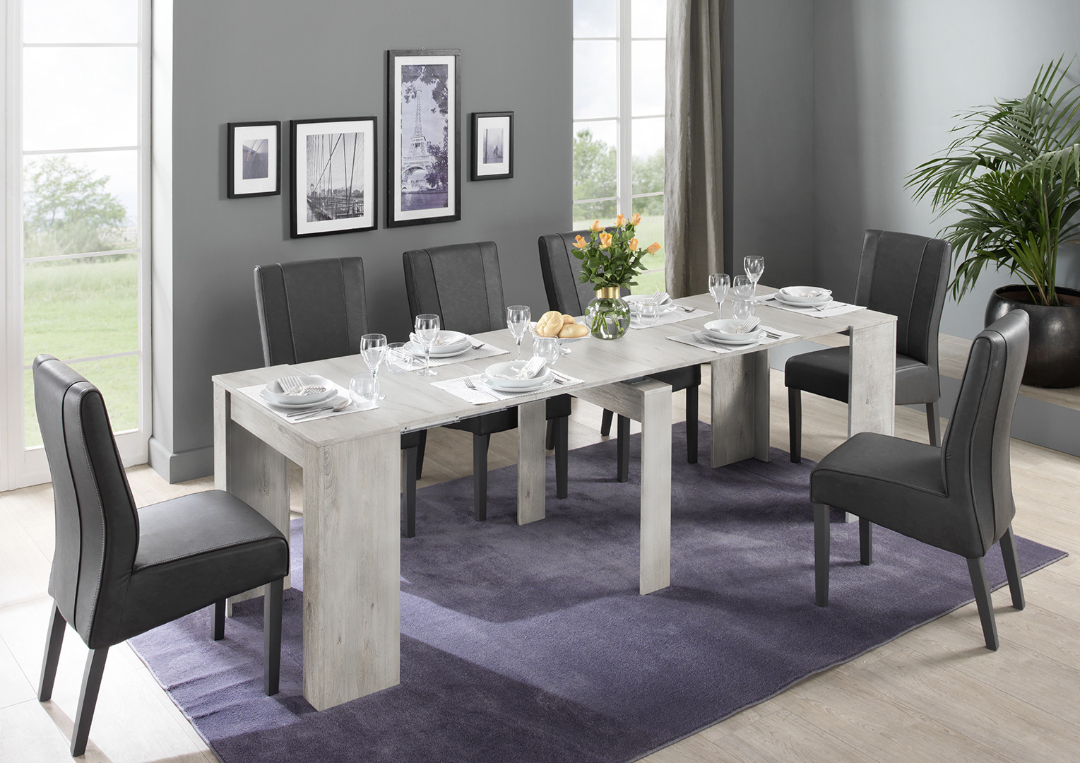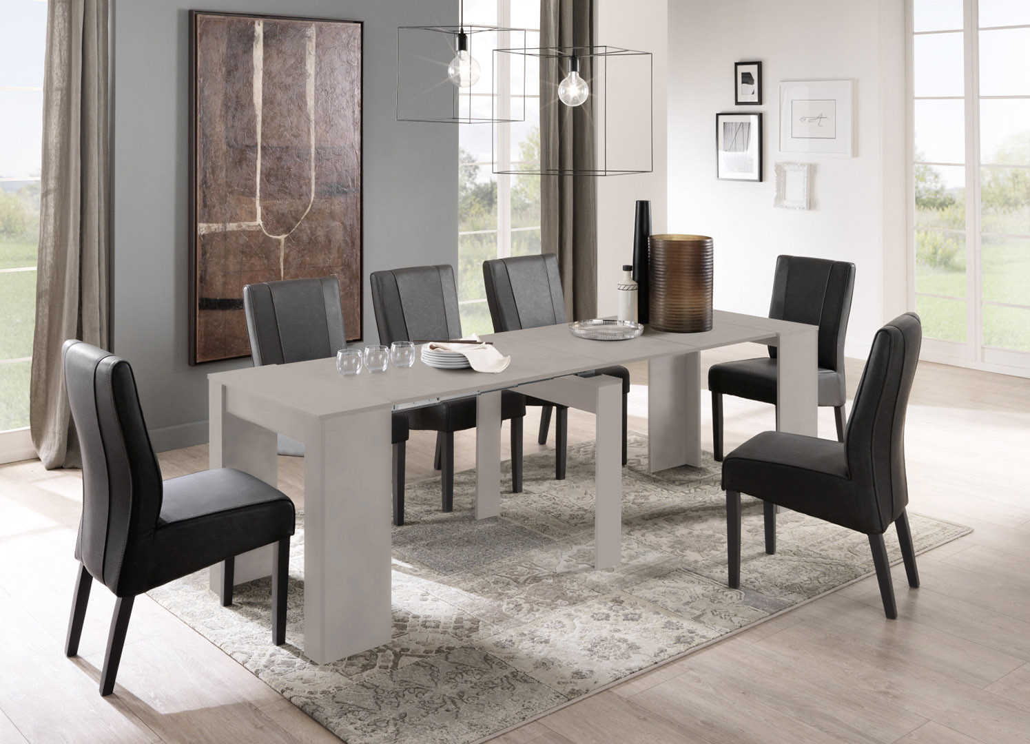 Pratique et astucieuse, cette table de salle à manger contemporaine extensible vous offre différents usages. Grâce à ses 4 allonges, vous pouvez facilement et rapidement transformer votre console en table. Vous pouvez ainsi l'utiliser à votre guise, comme table ou comme bureau, selon vos besoins. Son système de repli, simple et malin, vous permet ensuite de ranger facilement les allonges sous la console, dans l'emplacement prévu à cet effet. C'est donc un meuble deux en un qui vous est proposé pour correspondre à toutes vos aspirations.