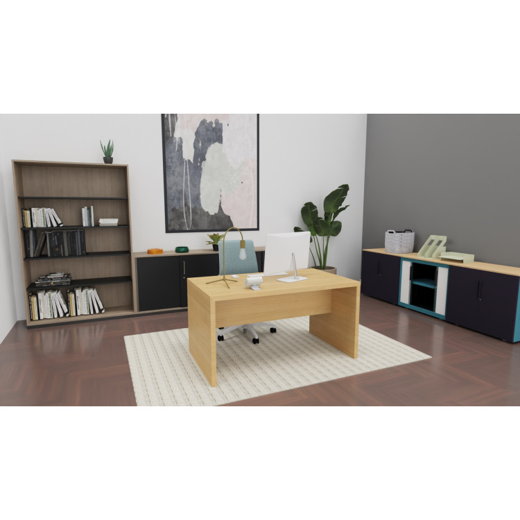 | Piétement | Panneau mélamine ép. 38 mm assorti au plateau équipé de vérins de réglage, course 15 mm - Assemblage sur inserts métalliques - Voile de fond mélamine structurel |