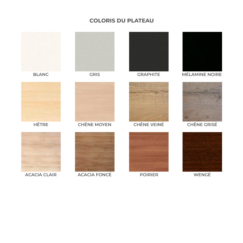 | Coloris | Graphite, blanc, gris, hêtre, chêne moyen, poirier, wengé, acacia clair, acacia foncé, chêne veiné ou chêne grisé |