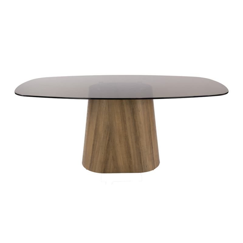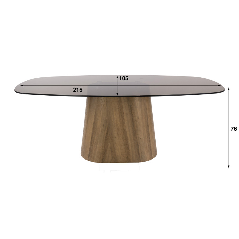 La forme de cette table de salle à manger ovale est l'un de ses atouts majeurs : sans angles saillants, elle favorise une circulation fluide autour d'elle et s'intègre harmonieusement dans des espaces variés. Son piétement en MDF revêtu d'un décor chêne chaleureux contraste élégamment avec la froideur du verre fumé, créant ainsi un équilibre parfait entre modernité et chaleur naturelle. L'association du coloris chêne et du verre fumé s'adapte aisément à de nombreux styles d'intérieur, du scandinave au contemporain.