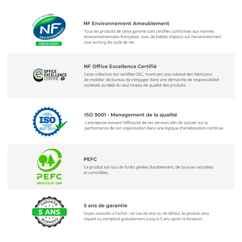 Plus de 80% des gammes sont certifiées OEC, montrant une volonté des fabricants de mobilier de bureau de s’engager dans une démarche de responsabilité sociétale au-delà du seul niveau de qualité des produits.
