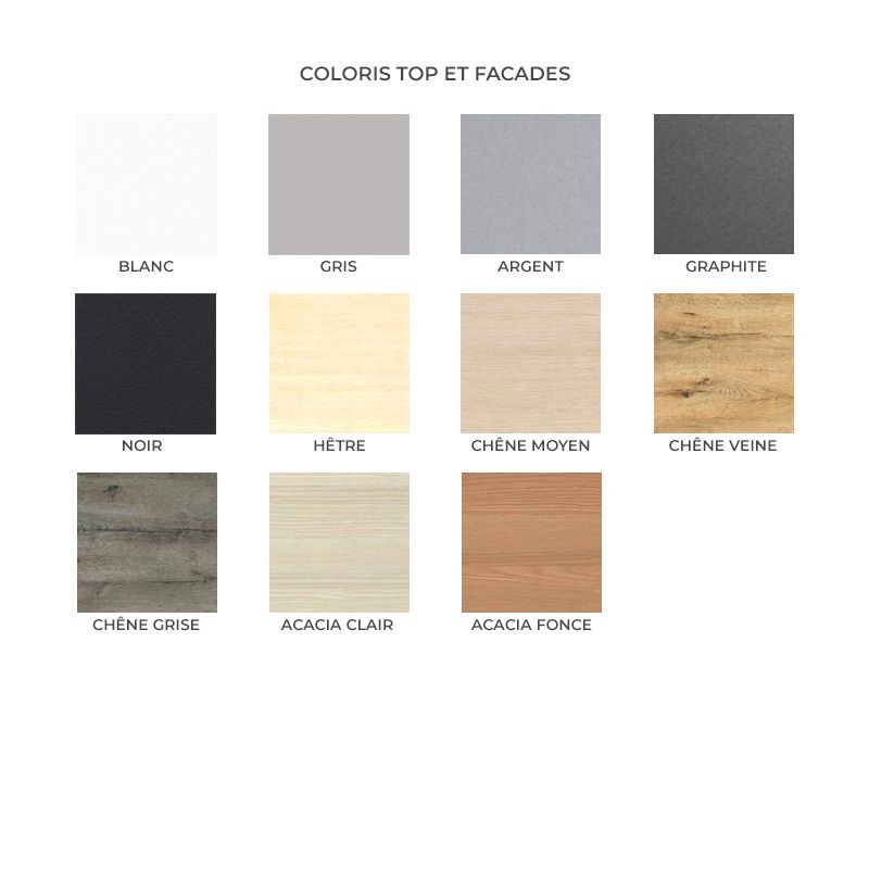 | Coloris | Graphite, blanc, gris, hêtre, chêne moyen, acacia clair, acacia foncé, chêne veiné ou chêne grisé |