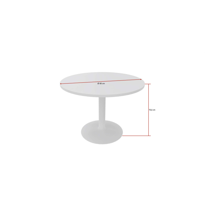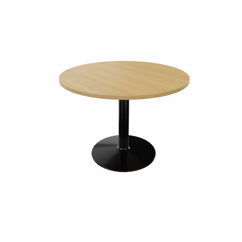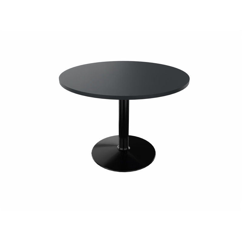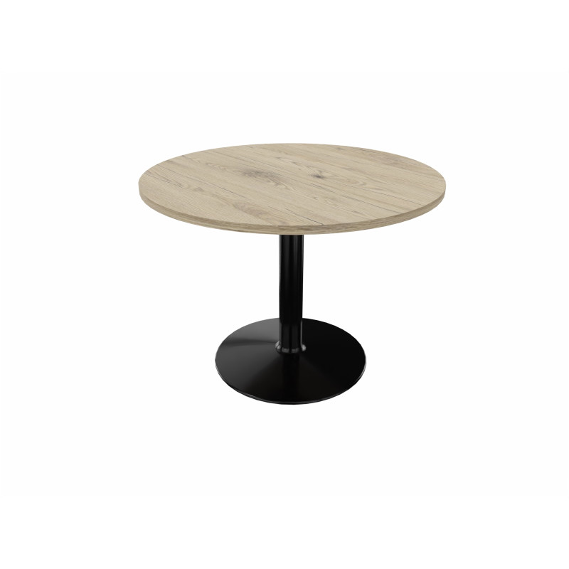 Il s'agit d'un mobilier de salle de réunion de forme ronde qui fait 73, 5 cm de hauteur et qui dispose d'un diamètre variant entre 80, 100 et 120 cm. Son piètement est composé d'un pied central rond en tube d'acier et d'une embase respectivement de 89 mm et de 710 mm de diamètre. Il se décline en quatre coloris différents, à savoir le gris aluminium, le noir, le blanc et l'anthracite. Le piètement est surplombé d'un plateau de 25 mm d'épaisseur, composé de panneaux de particules agglomérées.