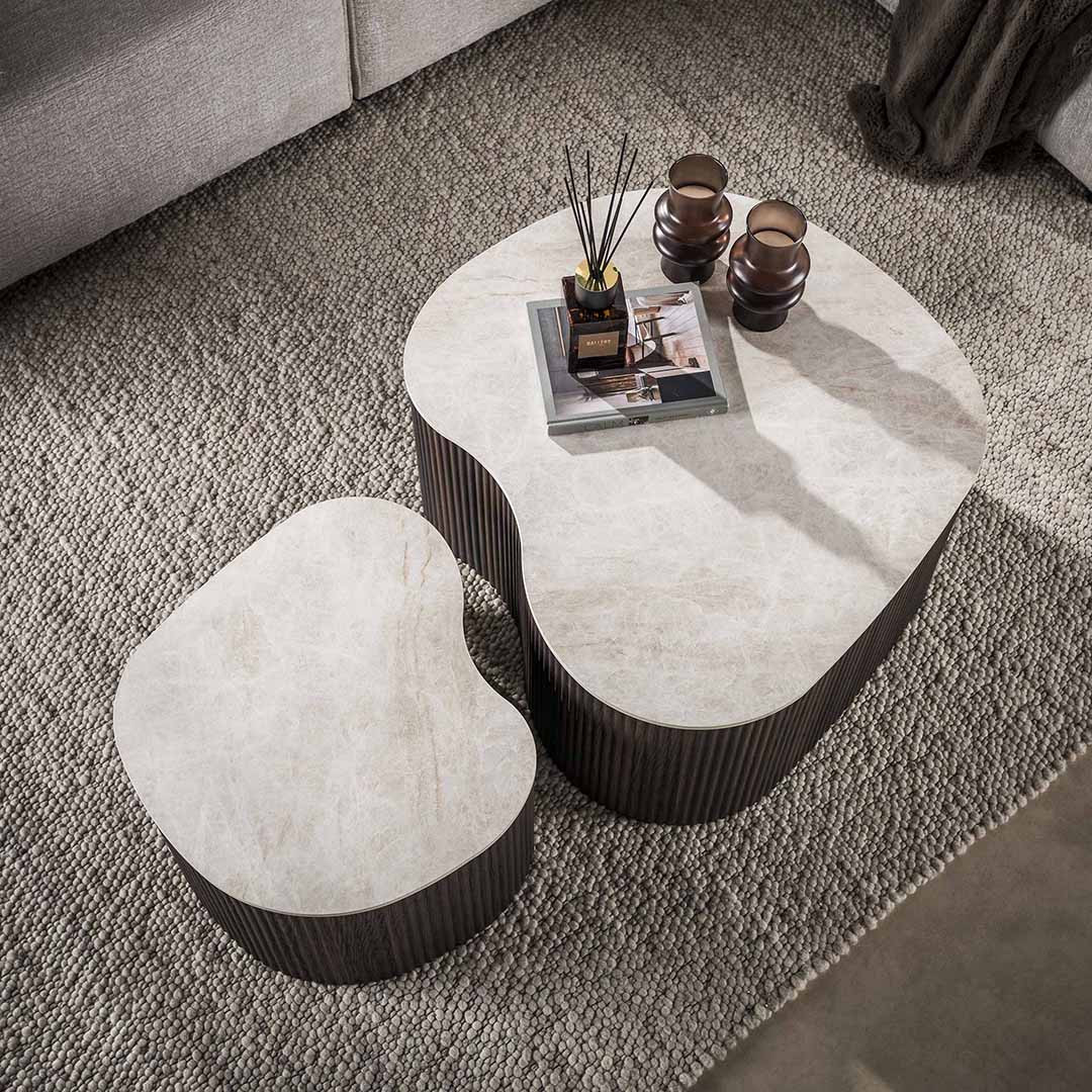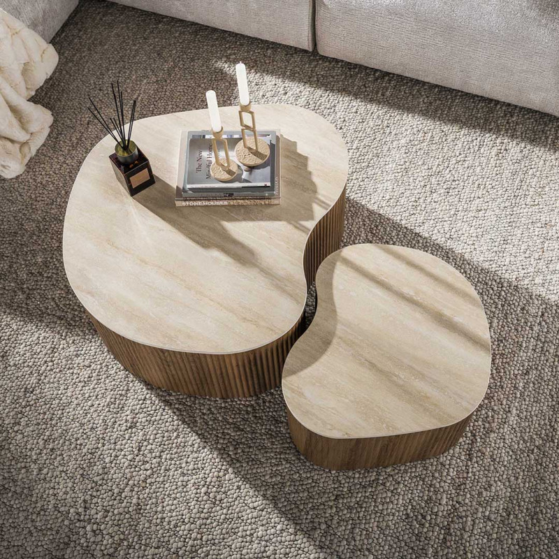 Grâce à leurs dimensions complémentaires – L 60 x H 35 x P 56 cm pour la petite et L 90 x H 39 x P 85 cm pour la grande – ces tables de salon s'imbriquent avec élégance et permettent de moduler votre espace selon vos besoins. Idéales pour poser vos livres, votre télécommande ou un plateau de service, elles allient praticité et style avec une grande facilité. En tant que table basse modulable, elles conviennent parfaitement aux petits comme aux grands espaces, offrant une flexibilité appréciable au quotidien.