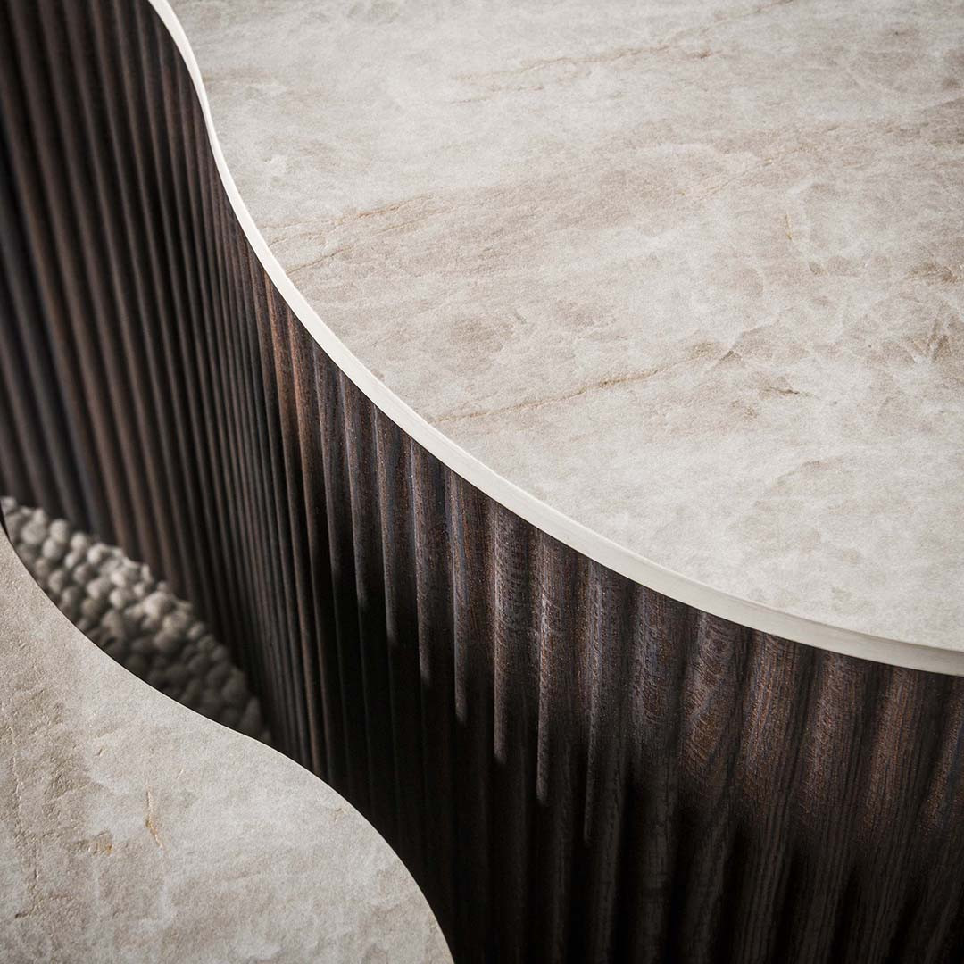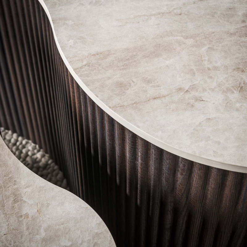 Le plateau en céramique est sans conteste le point fort de ces tables basses en céramique, offrant une surface à la fois résistante et élégante. Selon le coloris choisi, il imite à la perfection l'aspect travertin ou marbré, deux finitions très prisées dans la décoration d'intérieur actuelle. Cette céramique de qualité est facile d'entretien : un simple chiffon doux et humide suffit pour la nettoyer, ce qui en fait un choix idéal pour un usage quotidien. La structure en MDF revêtu d'un décor chêne ou brun assure robustesse et cohérence visuelle avec le plateau, créant un ensemble harmonieux et durable.