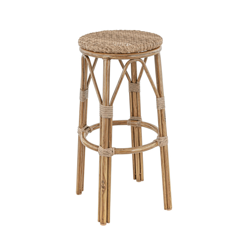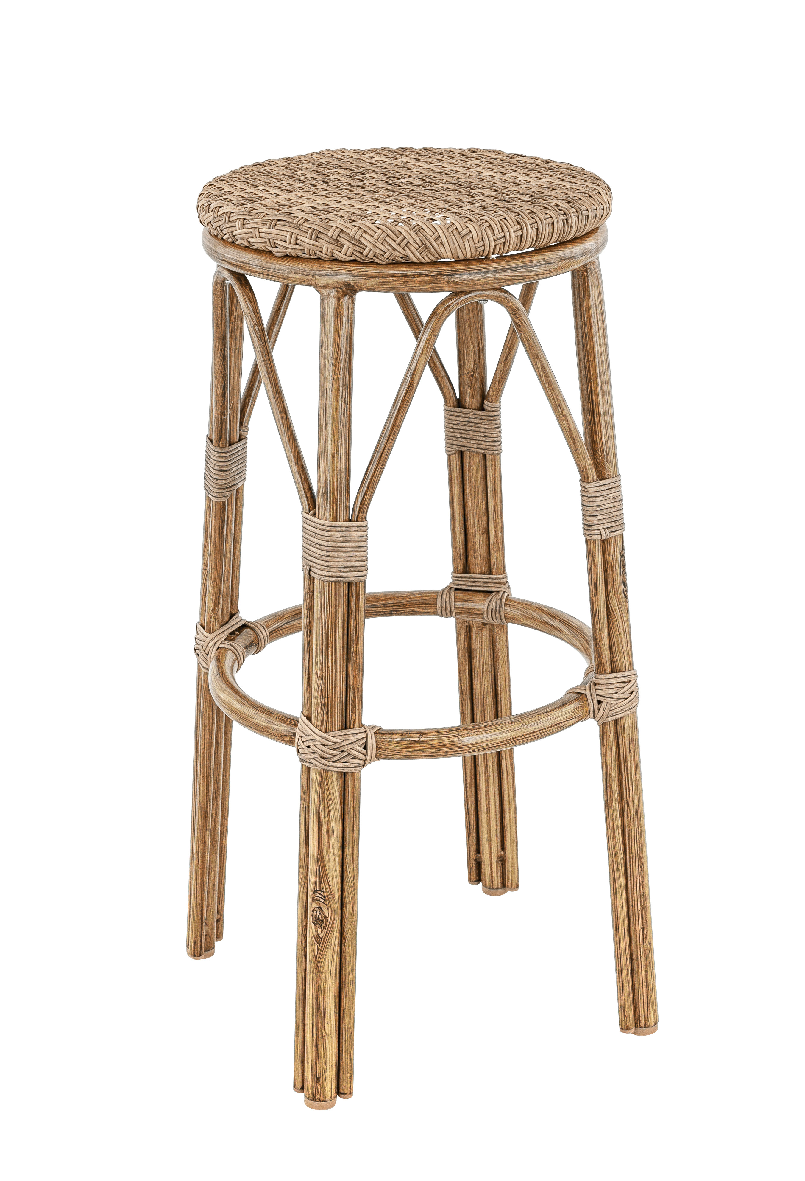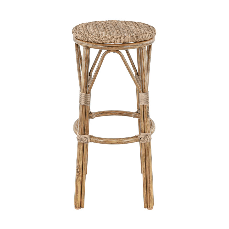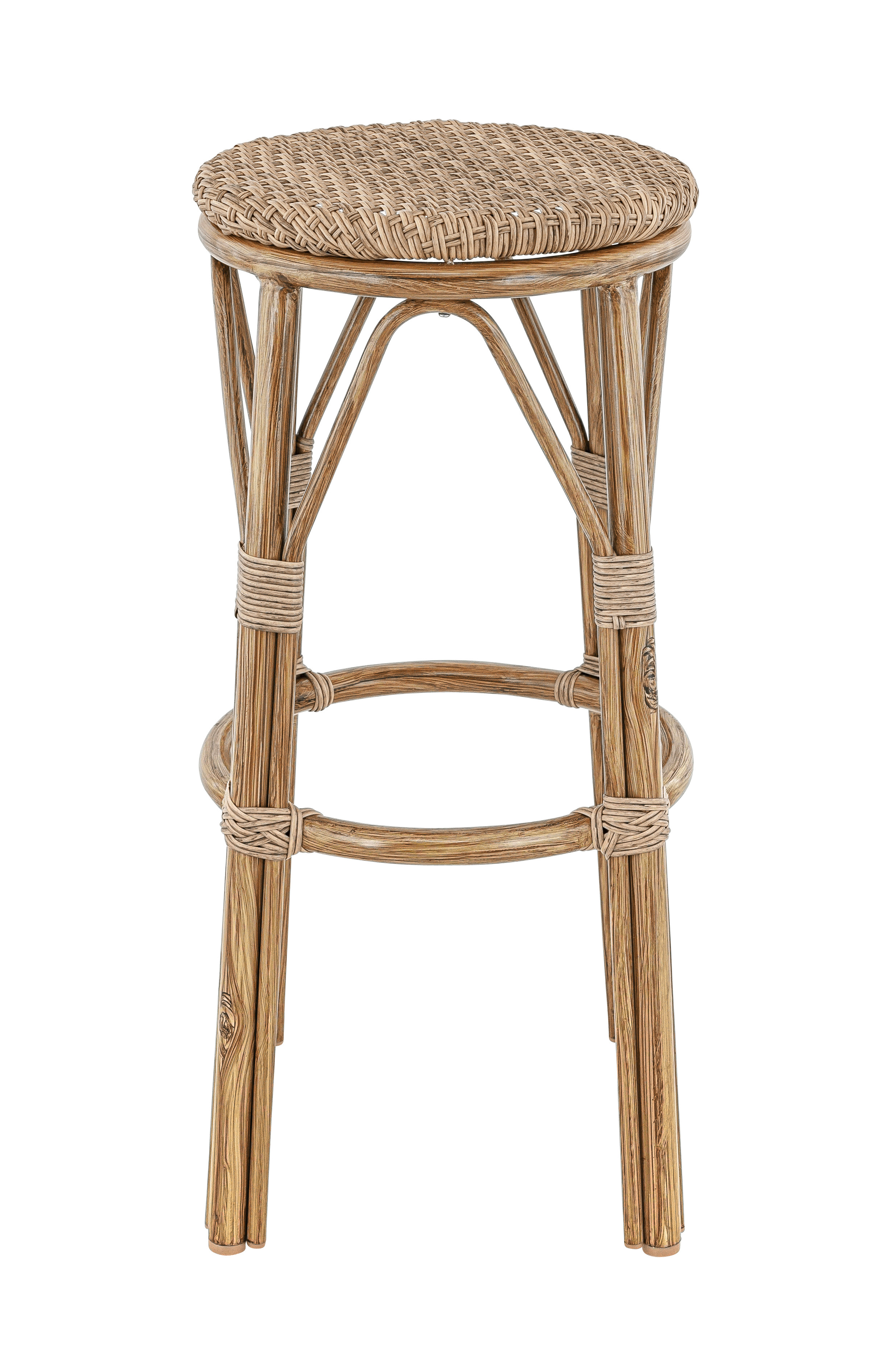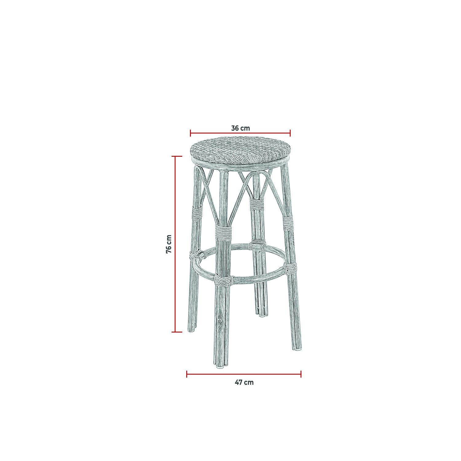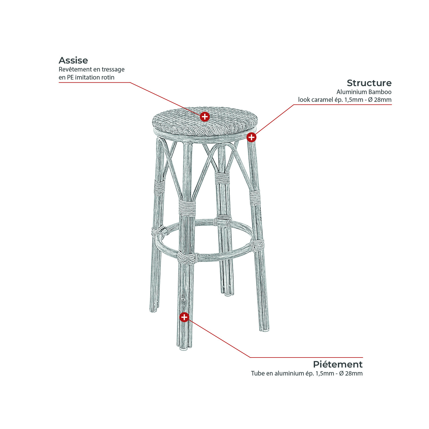 Avec sa hauteur de 76 cm et son diamètre de 36 cm, ce tabouret de bar s'intègre harmonieusement aux comptoirs et tables hautes, ajoutant une touche naturelle et élégante à votre espace. Le piètement en aluminium, recouvert d'une peinture époxy effet bamboo caramel, apporte une note exotique tout en garantissant une grande stabilité grâce à sa base de 47 cm. Parfait pour les terrasses, même sur des sols irréguliers.