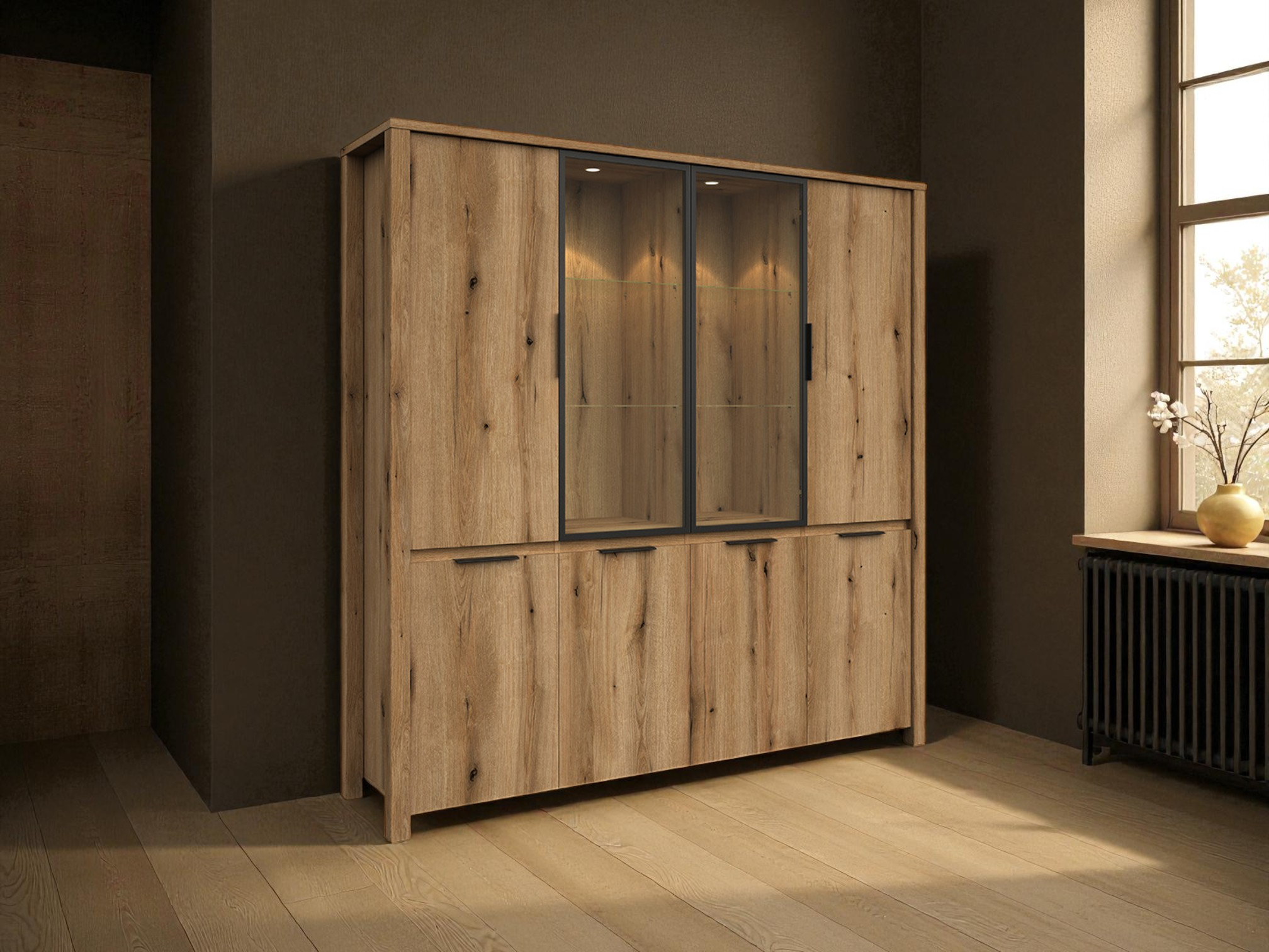 Ce meuble de salle à manger dispose de six portes battantes, dissimulant huit étagères en bois et quatre en verre, parfaites pour ranger aussi bien votre vaisselle que vos objets de décoration. Avec une longueur de 197 cm, une hauteur de 200 cm et une profondeur de 48 cm, il offre un espace de rangement généreux sans encombrer visuellement votre pièce. L’éclairage LED inclus met en valeur les objets exposés sur les étagères vitrées, créant une ambiance chaleureuse et sophistiquée. Ce vaisselier/argentier est ainsi une pièce centrale incontournable dans toute salle à manger moderne.