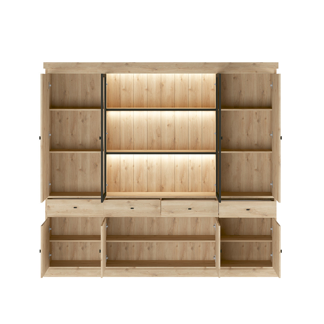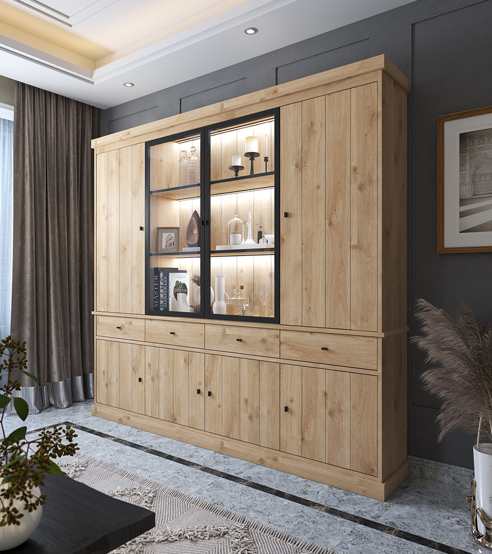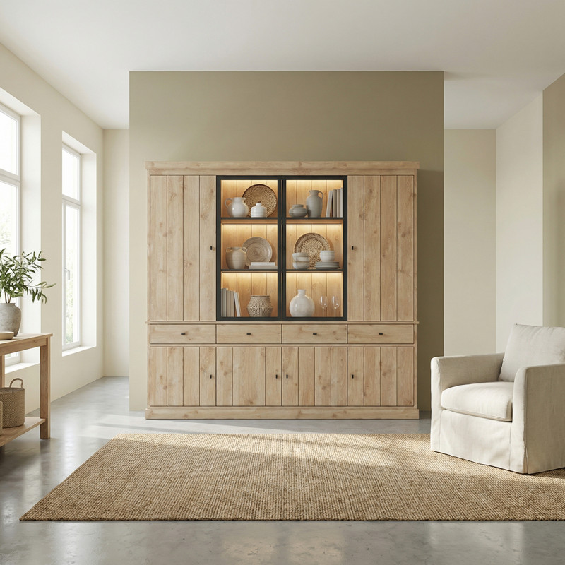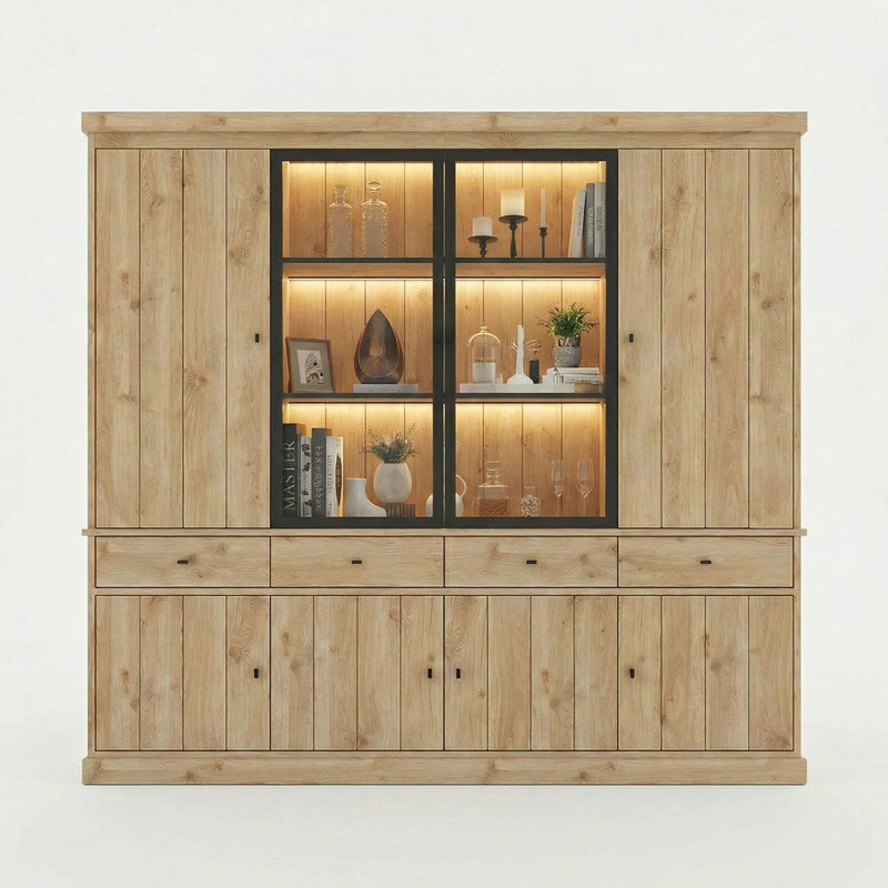 Ce généreux meuble de salle à manger intègre également une option LED pour mettre en valeur vos plus belles pièces de vaisselle ou votre argenterie de famille. Les jeux de lumière ainsi créés apportent une dimension décorative supplémentaire et transforment ce meuble en véritable vitrine d'exposition. Avec une profondeur contenue de 40 cm, il s'adapte aux espaces sans empiéter sur la circulation, un compromis idéal entre capacité de rangement et praticité au quotidien.