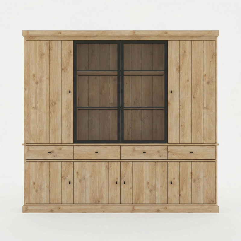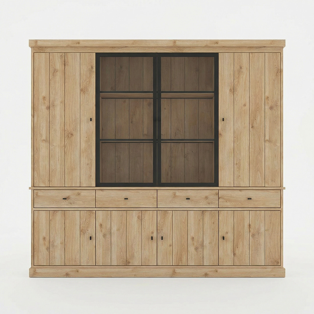 La construction de ce vaisselier repose sur des panneaux de particules mélaminés de haute qualité, complétés par des profils décoratifs en MDF et des poignées en zinc au design soigné. Ses 8 portes battantes, ses 9 étagères et ses 4 tiroirs permettent d'organiser vaisselle, argenterie, linge de table et accessoires avec une liberté totale. La finition mélaminée assure une résistance optimale aux chocs et aux rayures du quotidien, garantissant un meuble qui traverse le temps sans perdre de son éclat.