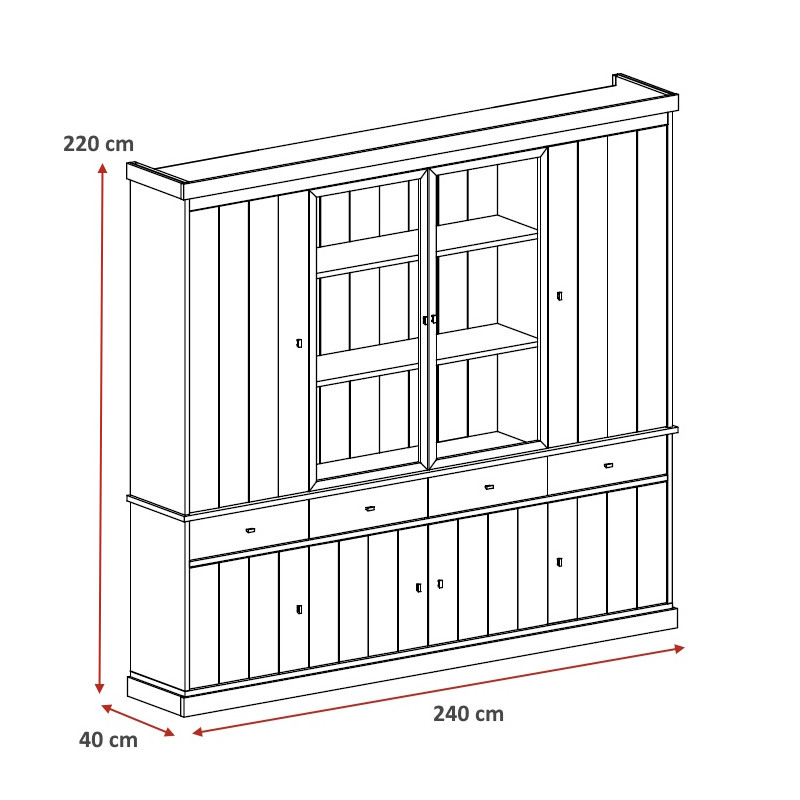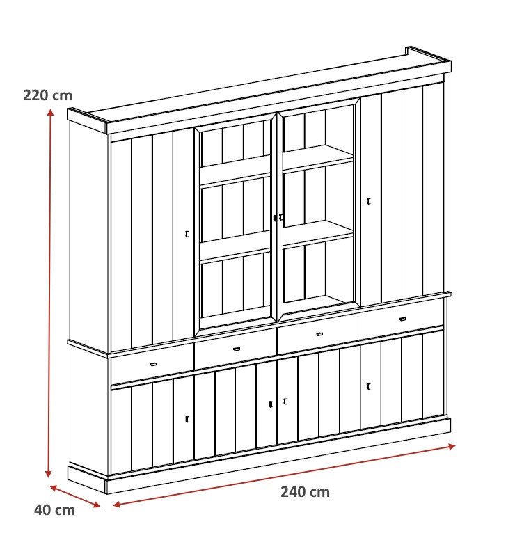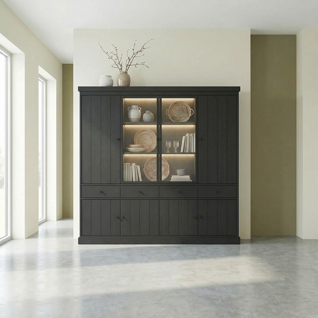 Avec ses 220 cm de hauteur et ses 40 cm de profondeur, le Valeria offre une capacité de stockage généreuse pensée pour répondre aux besoins des familles les plus exigeantes. En tant que vaisselier et argentier de grande envergure, il dispose de 8 portes battantes, 9 étagères modulables et 4 tiroirs spacieux, permettant d'organiser avec soin votre vaisselle, vos couverts, vos verres et tous vos accessoires de table. Chaque détail a été pensé pour optimiser l'espace disponible tout en maintenant une esthétique soignée et cohérente.