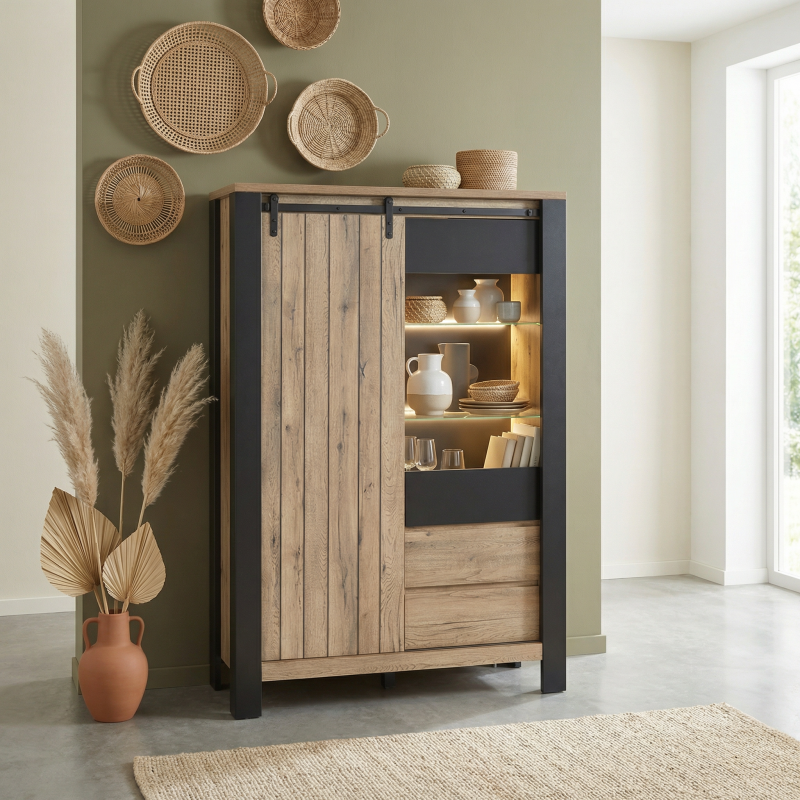 Envie d’ajouter une touche de charme industriel à votre intérieur ? Le vaisselier/argentier industriel chêne/noir Simeo de Deladeco est exactement ce qu'il vous faut. Fabriqué en Belgique, ce meuble de rangement combine solidité et style grâce à sa structure en panneaux de particules de haute qualité, habillée d’un élégant décor chêne/noir et renforcée par des rails en métal noir. Avec ses dimensions généreuses, il s’adapte parfaitement aux espaces modernes tout en apportant une esthétique industrielle unique.